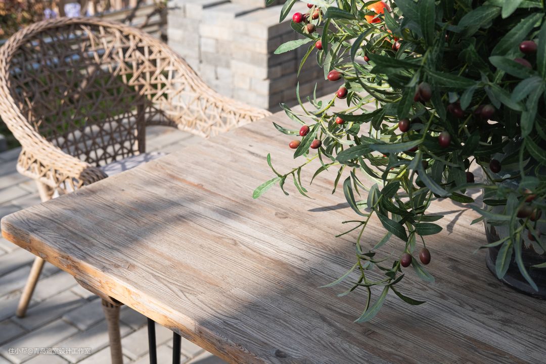 ⧠ 每天清晨起来会坐在凉亭下,带着冲泡的蜂蜜水,拿着ipad背单词。鸟叫声和鸡鸣声此起彼伏。 桌子是插接木板,做了防腐处理后,用铁架做了腿。凳子是室外藤编椅。幸福感从早晨开始感受。 #庭院 #花艺