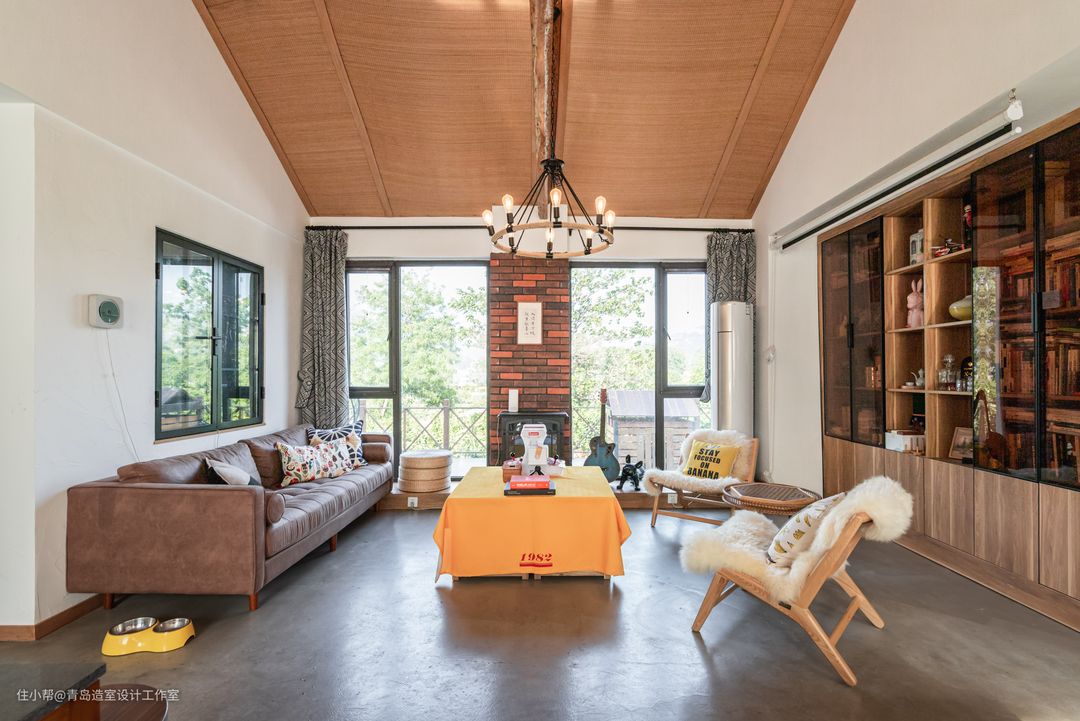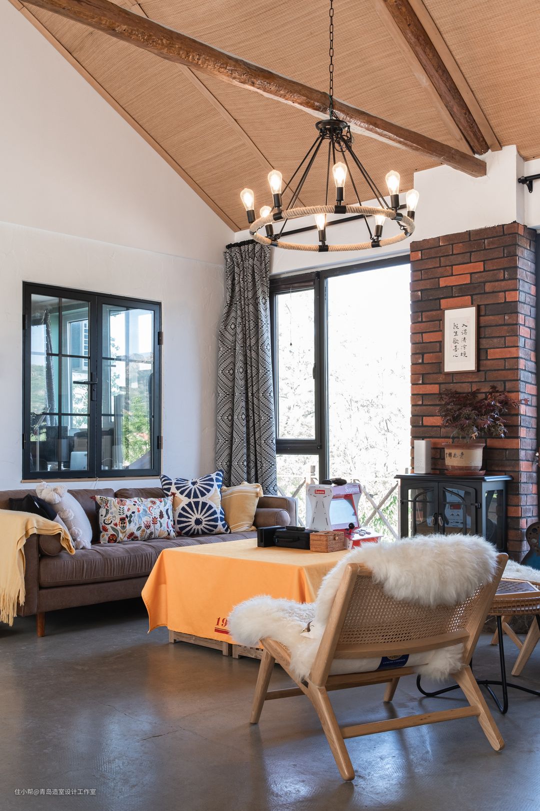 ⧠ 客厅我们将原本的窗户扩大并落地,中间因为是承重柱,所以只能保留,用砖墙文化石贴起来,搭配一个仿真火的壁炉以及其他的家具软装,有一种林中小屋的感觉。配合外面的绿树成荫,经常是我发呆的好地方。 吊顶上我们在餐厅和客厅的位置保留了原顶,在顶面钢板下面做一层保温层,然后用草席钉在保温层上,再用细木板把边缘压住再固定在龙骨上。 自从外面餐厅有了电视,客厅便成为了我们的游戏区和读书区。桌上游戏机通常是孩子们的最爱。 #客厅 #茶几 #沙发 #单椅 #吊灯