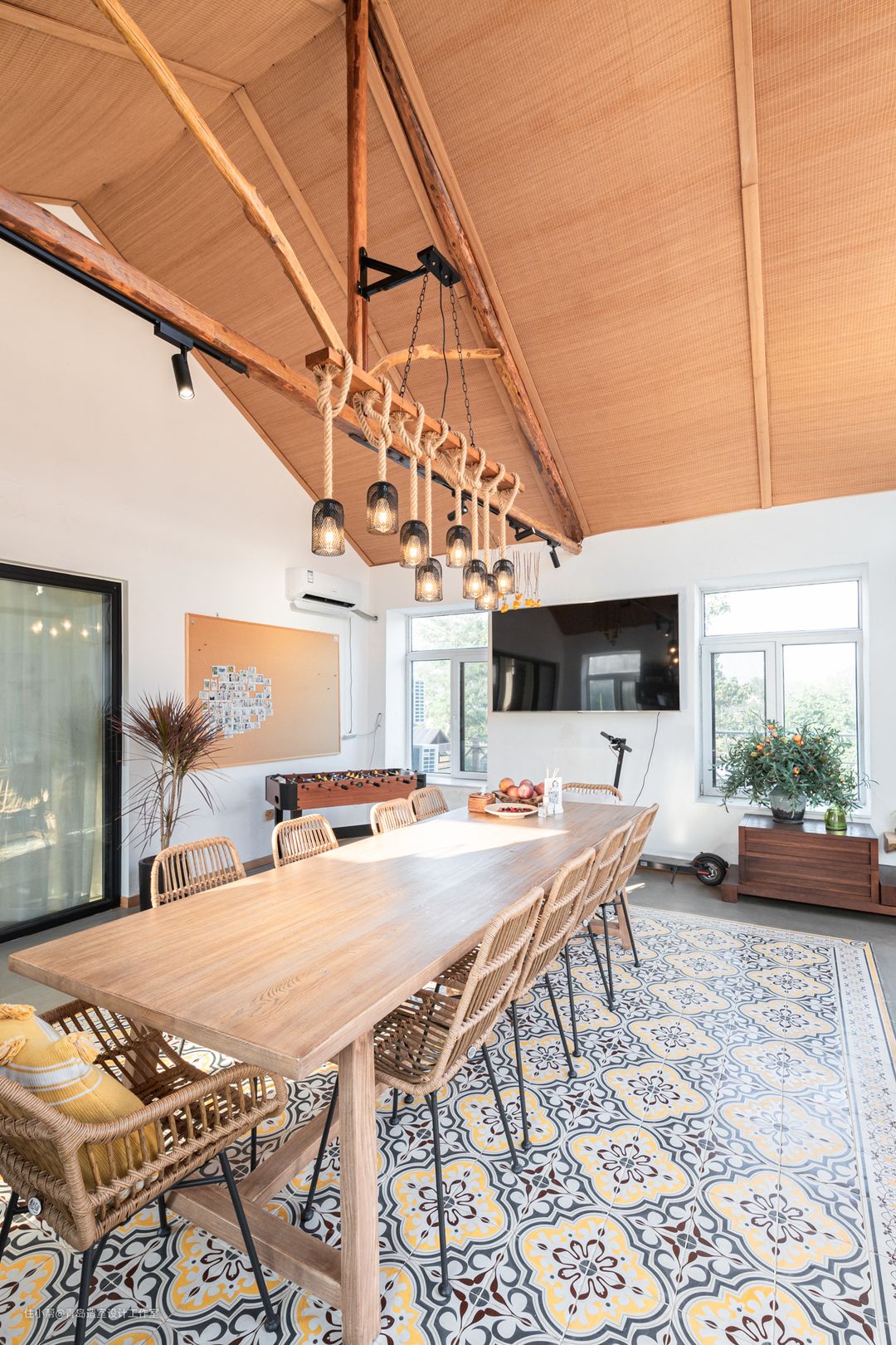 ⧠ 同时,这里又是我们平常的吃饭聚餐区,我和卢设计都非常喜欢很认真的吃早饭,所以我们经常会在没有紧急工作安排的日子起床后,做一顿很丰盛的早餐,在这里一边看早间新闻,一边吃完并看着窗外发一会呆。 或者是朋友客户来聚餐的日子,这里更是热闹,三米长的餐桌上摆满大大小小的盘子,有些人还要搬吧凳过来穿插着做。孩子们有的在旁边跑来跑去,有的在玩桌上足球,大人们悠闲地吃着饭。 #餐厅 #花砖 #餐桌椅