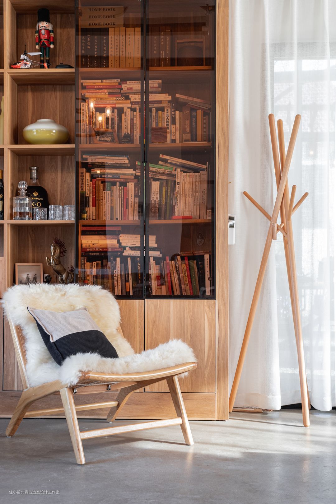 ⧠ 读书角是我们必须要设定的一个空间。书柜的形式以下部分为封闭储物,放些比较杂乱的东西。上部分就用书籍堆起来。本身书就是最好的装饰品。 #读书区 #单椅 #衣架 #书柜