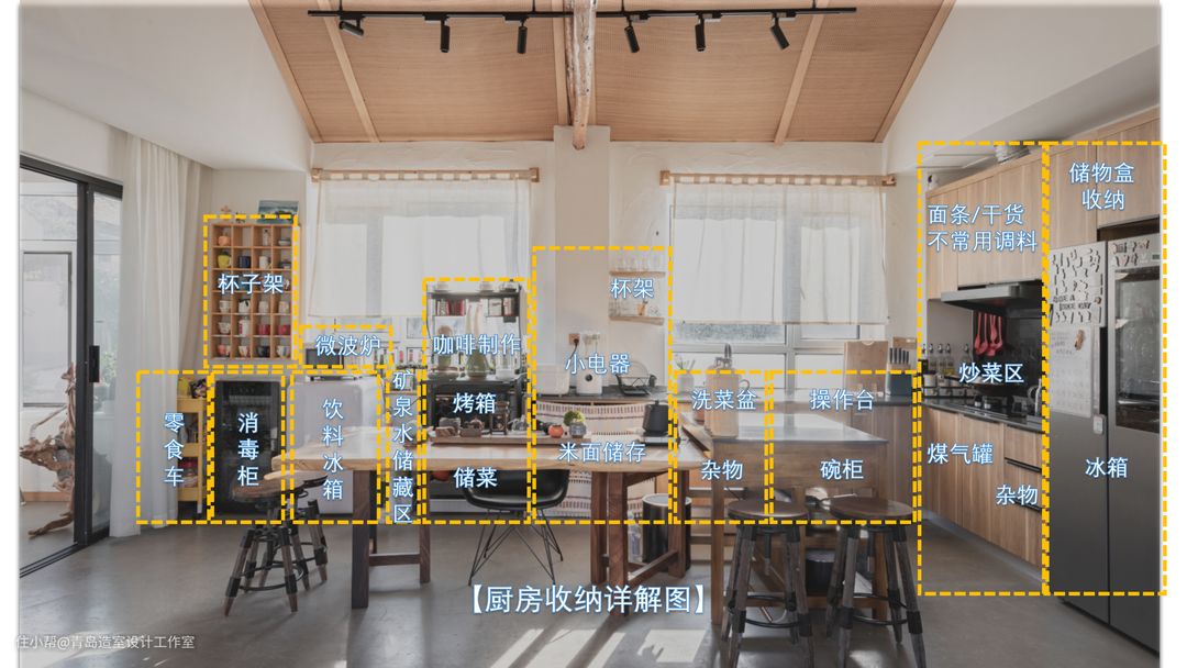 ⧠ 厨房可以说是麻雀虽小五脏俱全了。杯架服务饮料小冰箱和咖啡区;消毒柜靠近餐厅,方便直接拿取;米面储存区上面是蒸饭锅和破壁机等等这些都是相互依托,相互服务的。充分利用起靠墙的这一排储存空间,将中厨和西厨的功能全部容纳进去。 #厨房 #橱柜 #岛台