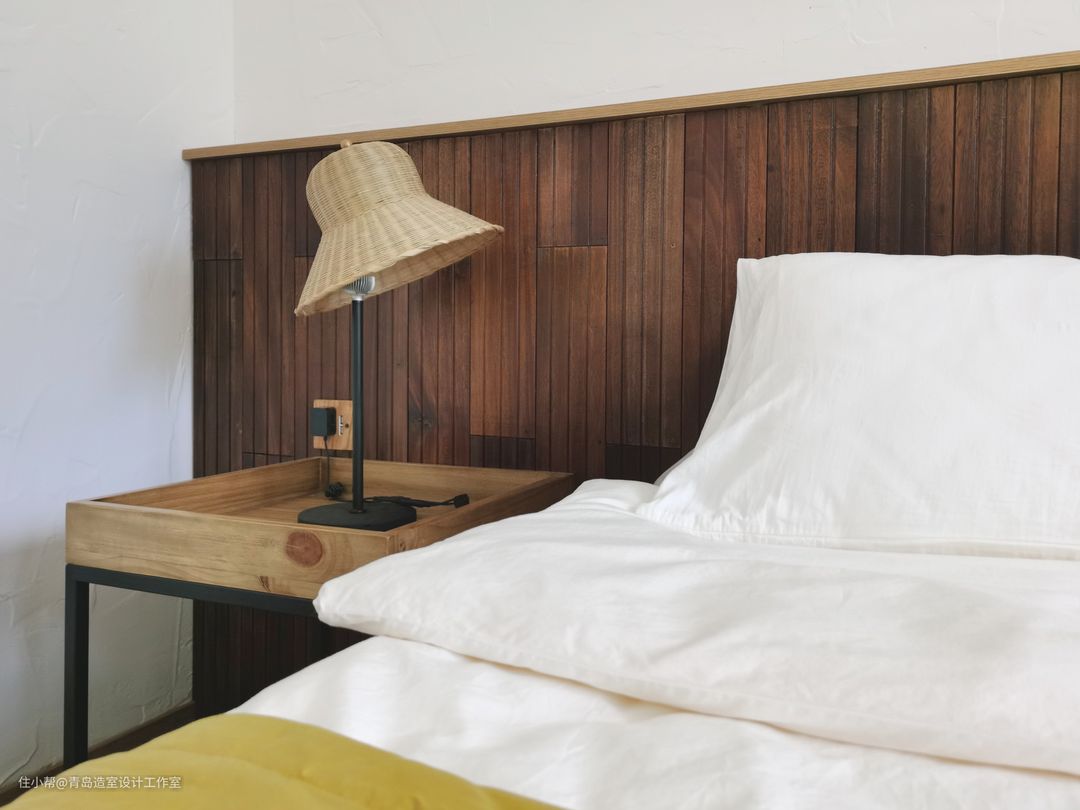 ⧠ 在每个床头都选择的实木USB插座。也是厌倦了各种线的缠绕交错。台灯是草帽形式的,充满趣味性的设计。#床头灯 #床头柜