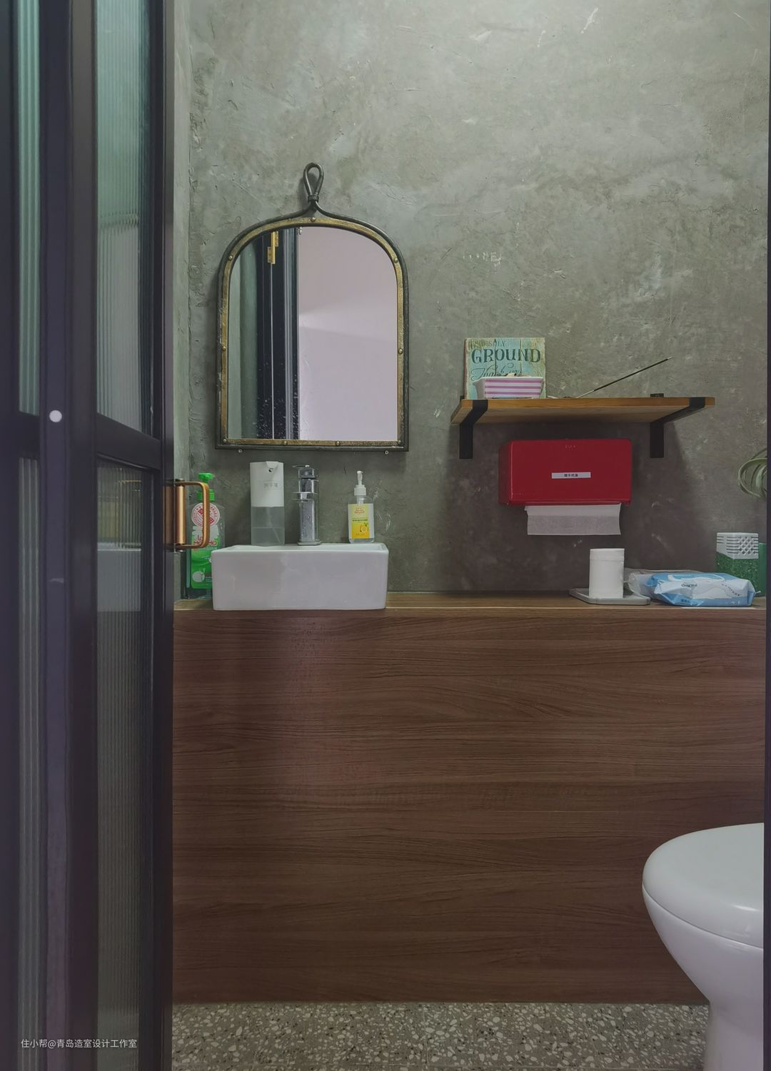 ⧠ 客卫卫生间只有1.5平方,所以使用折叠门的形式,用定制木作将水管位置包裹起来,形成置物台面。墙面搭配置物架来放香薰和装饰画。 #卫生间 #洗手盆 #挂镜