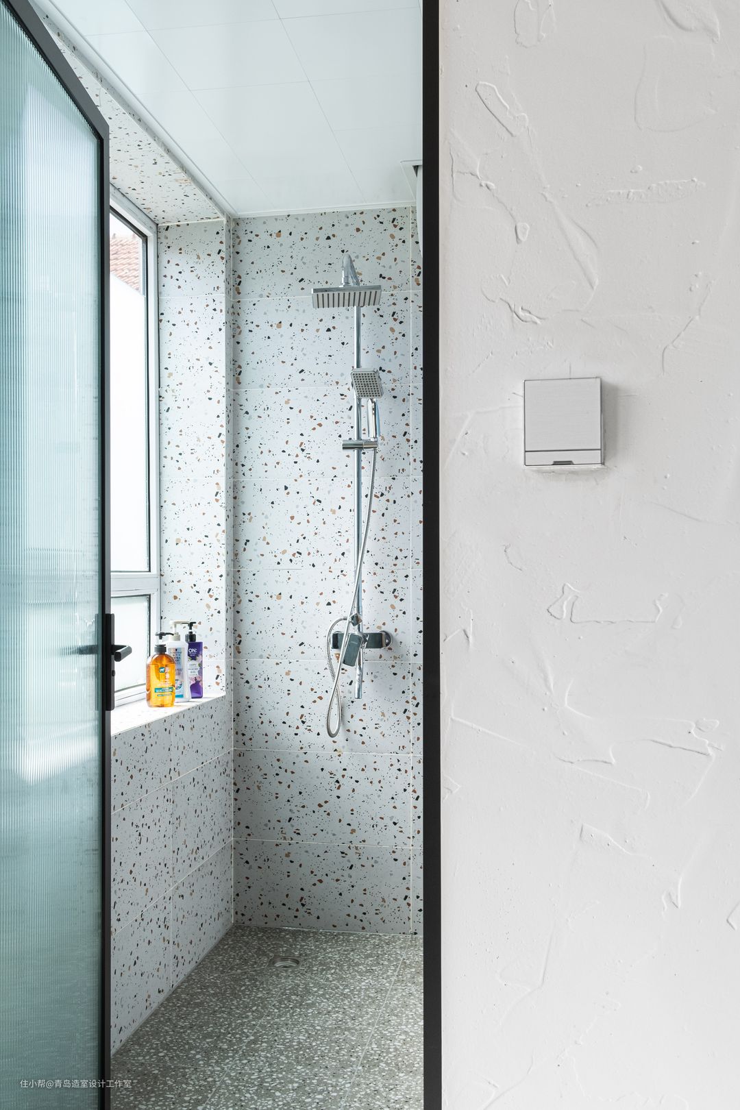 ⧠ 卫生间一瞥。水磨石的砖和长虹玻璃的搭配,协调,清爽。卫浴的淋浴花洒因为没有经过2020年寒冬的考验,所以今年换成了全铜材质的。外面开关是五合一卫生间吊顶电器的开关。 #卫生间 #水磨石砖