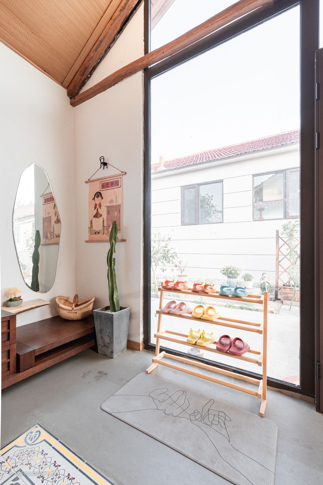 ⧠ 平面图上虚线部分的建筑将高度与后面建筑的高度拉平,因为房子是东西向,南面在正门入口位置,所 以为了寻求南面阳光,将南面建筑墙体打开二分之一,沿着房梁用钢化玻璃替代实墙。从门外看进去, 原本的木梁透出来,有着别样的感觉。 #落地门窗 #玄关