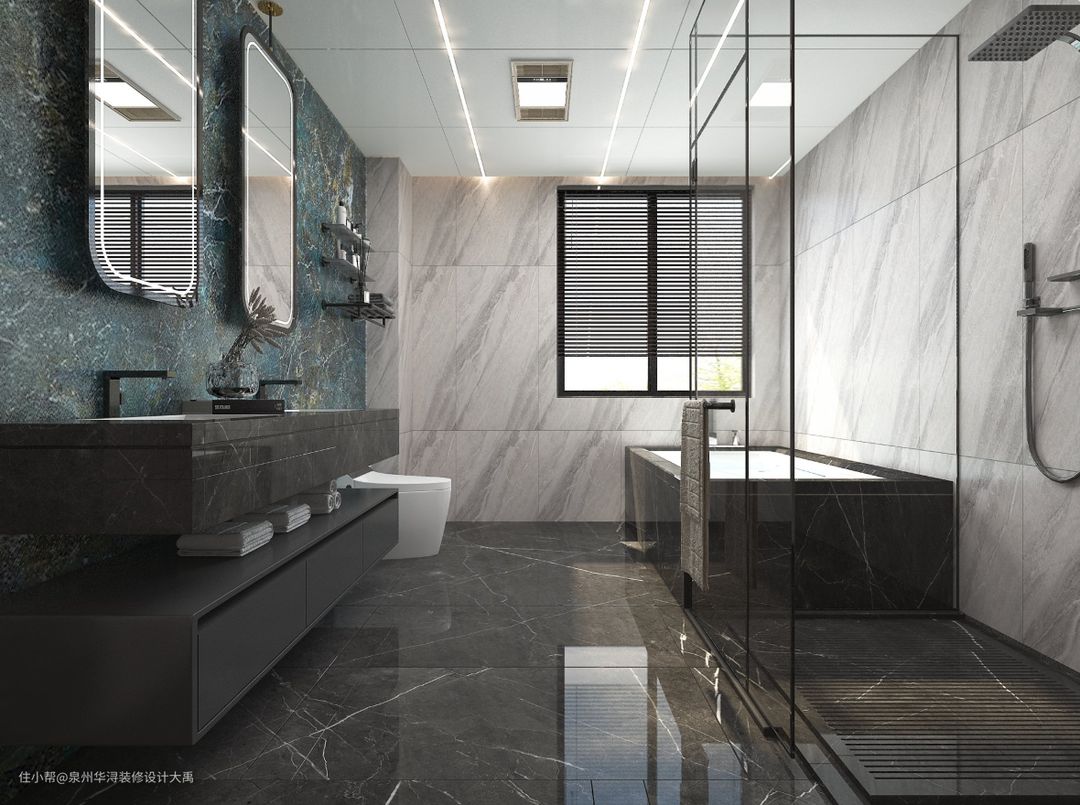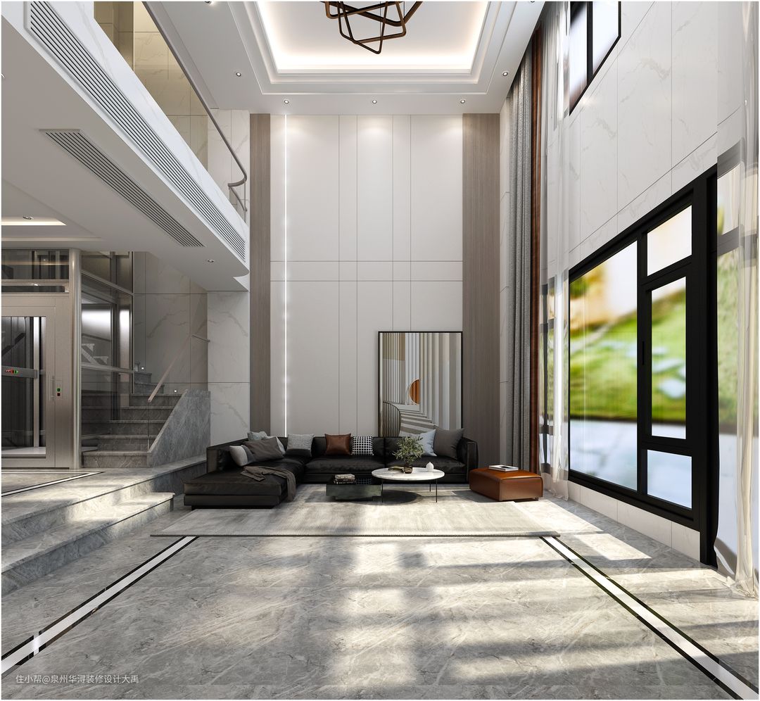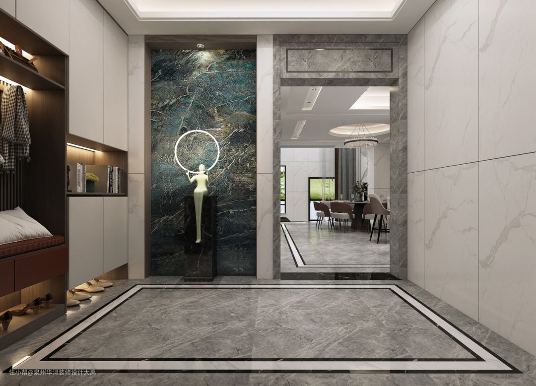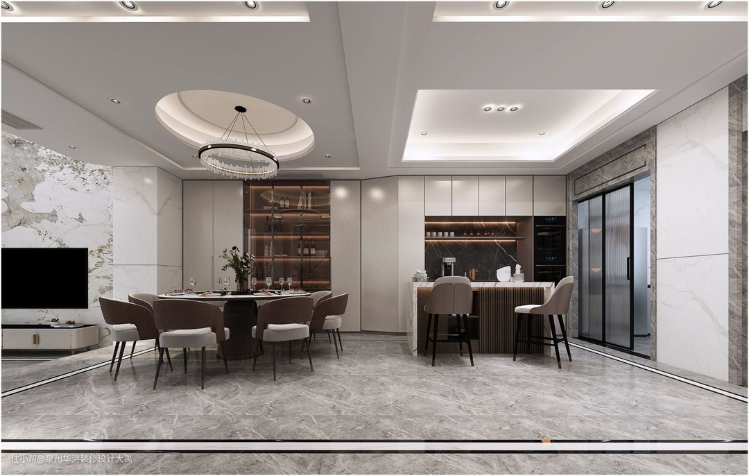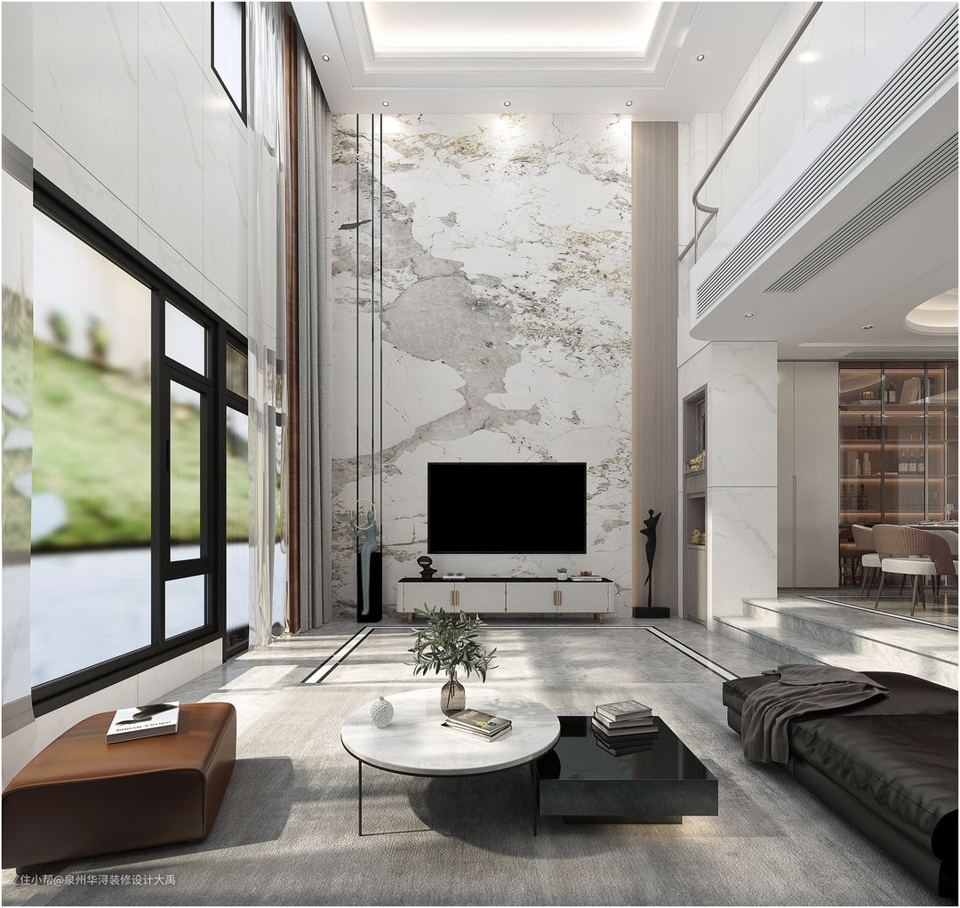 5米高的电视背景墙,全大理石铺贴,纹理纵横交错,远观仿佛九州星河,恢弘大气。整排的落地窗不仅能饱览风景,还提升了空间采光,让客厅多了一缕光的温度,白日如画,夜色如诗。