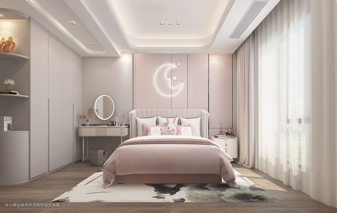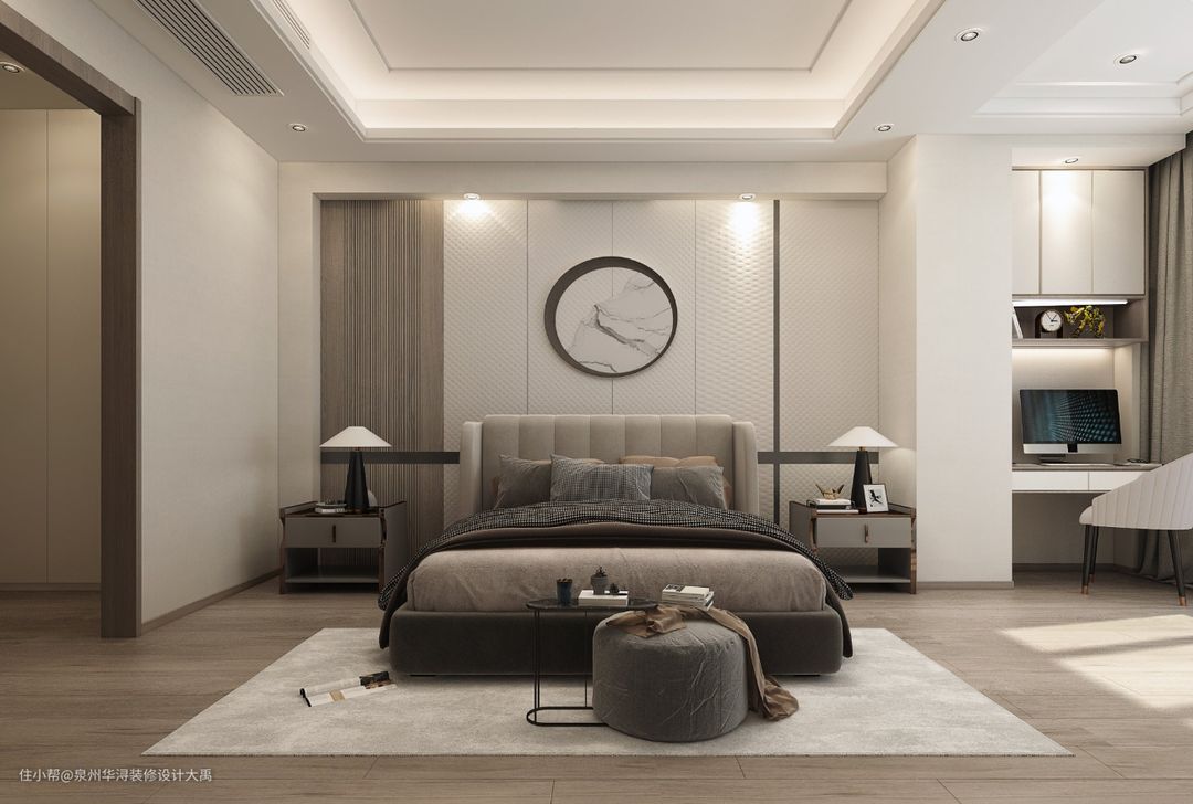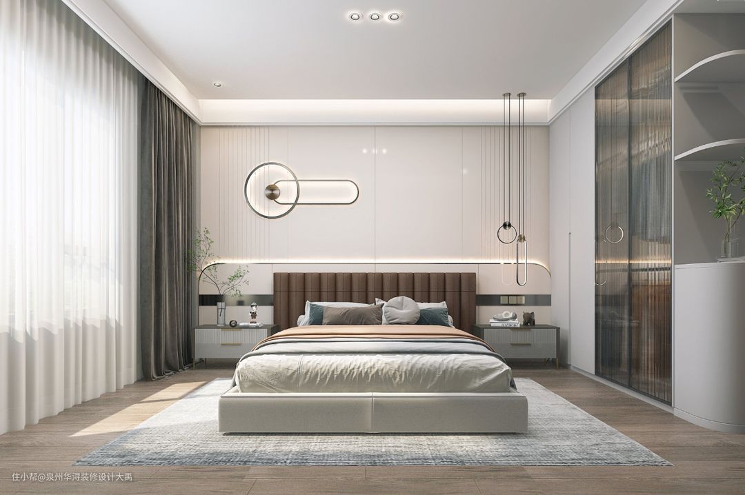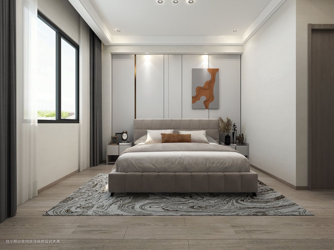 二楼是两间专属的卧室套间,把长辈房做在二楼也方便了老人的行动。主卧暖色搭配,凸显空间质感,皮质软包通过围边的形式将床包裹,再通过灯光修饰营造温馨的睡眠环境。
