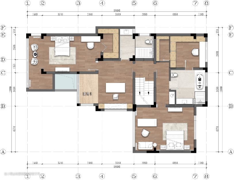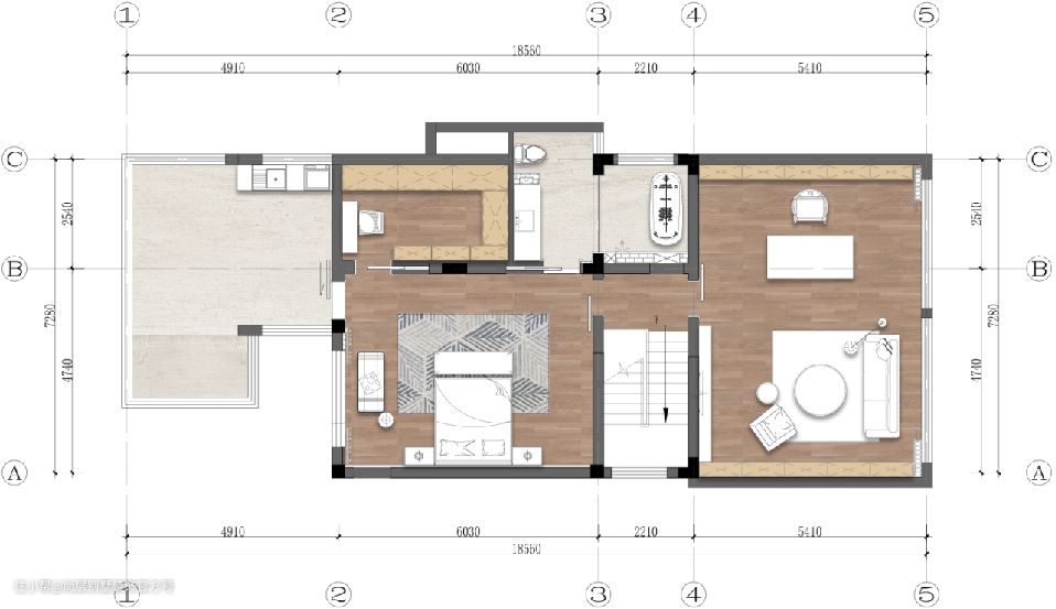 二层是妈妈的套房和书房,还有一个客房。业主妈妈的房间可以俯瞰院子的全景,整体风格更温馨稳重。