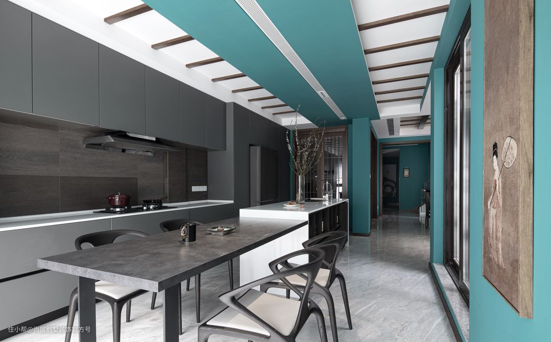 厨房的设计一切化繁为简,采用了黑白青的色调,在基础的功能上做到了极致简约,采用利落的线条来勾勒层次,增添了仕女图的装饰,更加细腻、流畅地展现了传统的中华文化精髓。