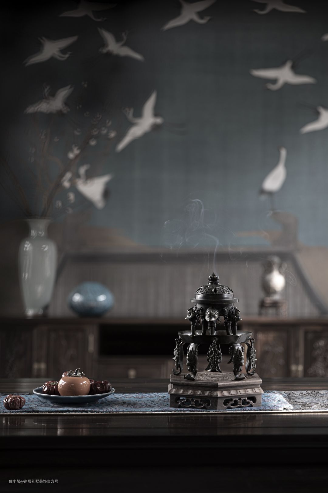 书房深色质感的木料,厚而不重,搭配中国传统趣物(香炉、笔墨纸砚、花瓶),点缀一抹精华。