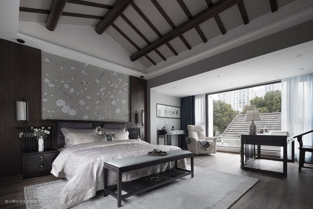 心之归处,是生活中最暖融融宽畅的向往。卧室以不同材质丰富细节,随处都与东方风韵相呼应。不管是床头花鸟的背景,还是阳台的木桌,灯具,屋顶的房梁设计,都与东方风格相融合。