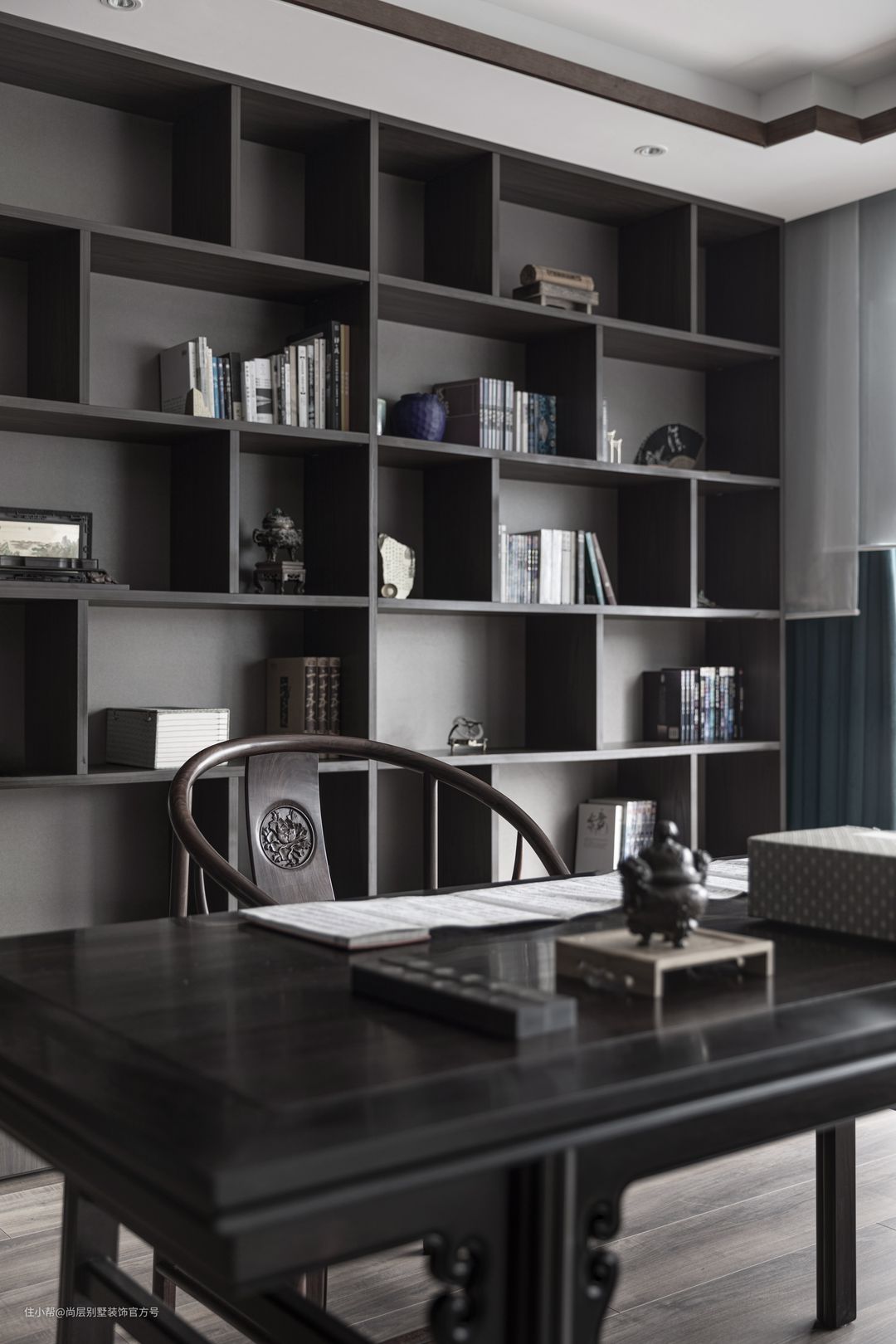 书房深色质感的木料,厚而不重,搭配中国传统趣物(香炉、笔墨纸砚、花瓶),点缀一抹精华。