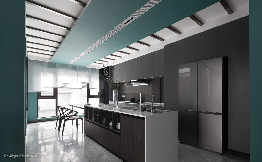 厨房的设计一切化繁为简,采用了黑白青的色调,在基础的功能上做到了极致简约,采用利落的线条来勾勒层次,增添了仕女图的装饰,更加细腻、流畅地展现了传统的中华文化精髓。