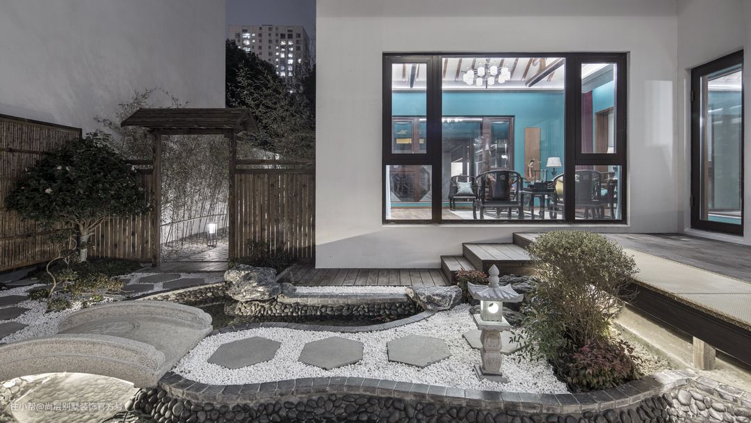 根据中式风格,庭院是长廊+绿植、假山,打造成一份显闲情雅致的多重感官。 让身处喧嚣的人们多了一处灵魂居所,一个可以放下羁绊、回归自我的地方。