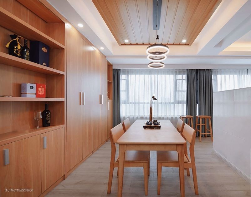 整面墙定制柜与餐桌椅保持同一色系,满足收纳需求,保证风格统一。