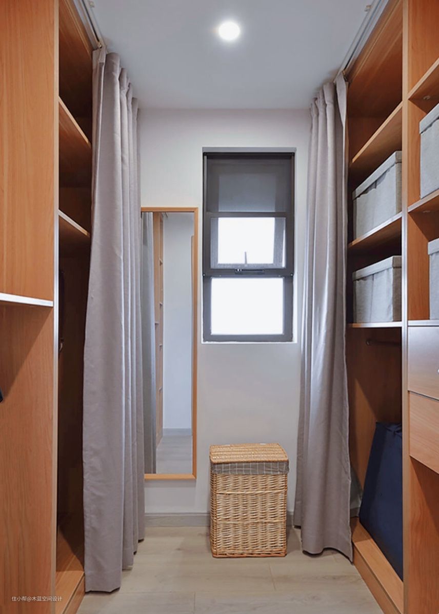 独立衣帽间,仅做柜体,没有安装柜门,用窗帘代替。
