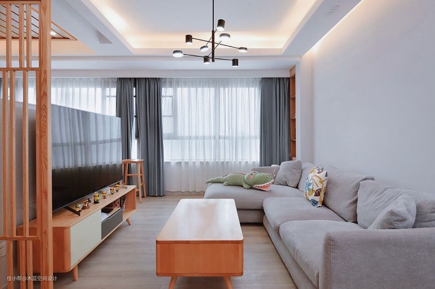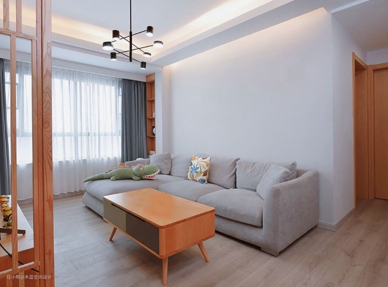 简单灰色沙发搭配木质家具,简单干净。 半墙隔断搭配木质隔断,变成一个环境背景墙,入户及景。