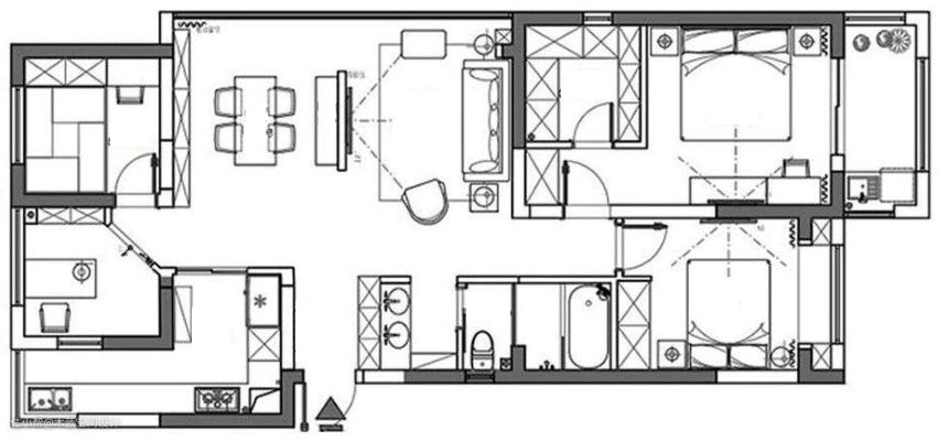 说在前面 本案为“一字”户型,南北通透,采光充足,原户型为三室两卫,业主是夫妻俩和一位活泼的小男孩,寒暑假的时候老人才会过来小住。 业主需求 1、收纳空间要足够 2、洗漱空间要大,需要浴缸 3、三间卧室保留还希望有独立的办公区 户型改造 1、原布局将厨房借用独立出一间小书房 2、厅内做半隔断墙面区分客厅和餐厅,同时不影响玄关采光 3、家里人口不多,将主卧原有卫生间改成独立衣帽间 4、借次卧部分空间,做双洗手台,加增浴缸