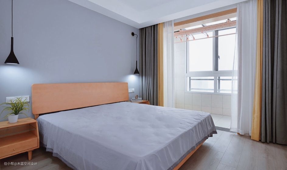 简单北欧风家具摆设,做床头背景墙暖灰色刷漆处理。