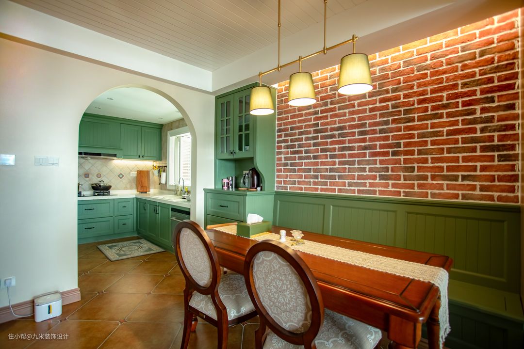 注重生活的舒适性,所以复古的沙发、野花盆栽、花布、铁艺制品都是房屋内常见的装饰物。整体的氛围优雅。装修中强调温馨含蓄,散发着淡定与从容。餐厅一侧做成了卡座,聚餐的时候也不会怕不够位坐。