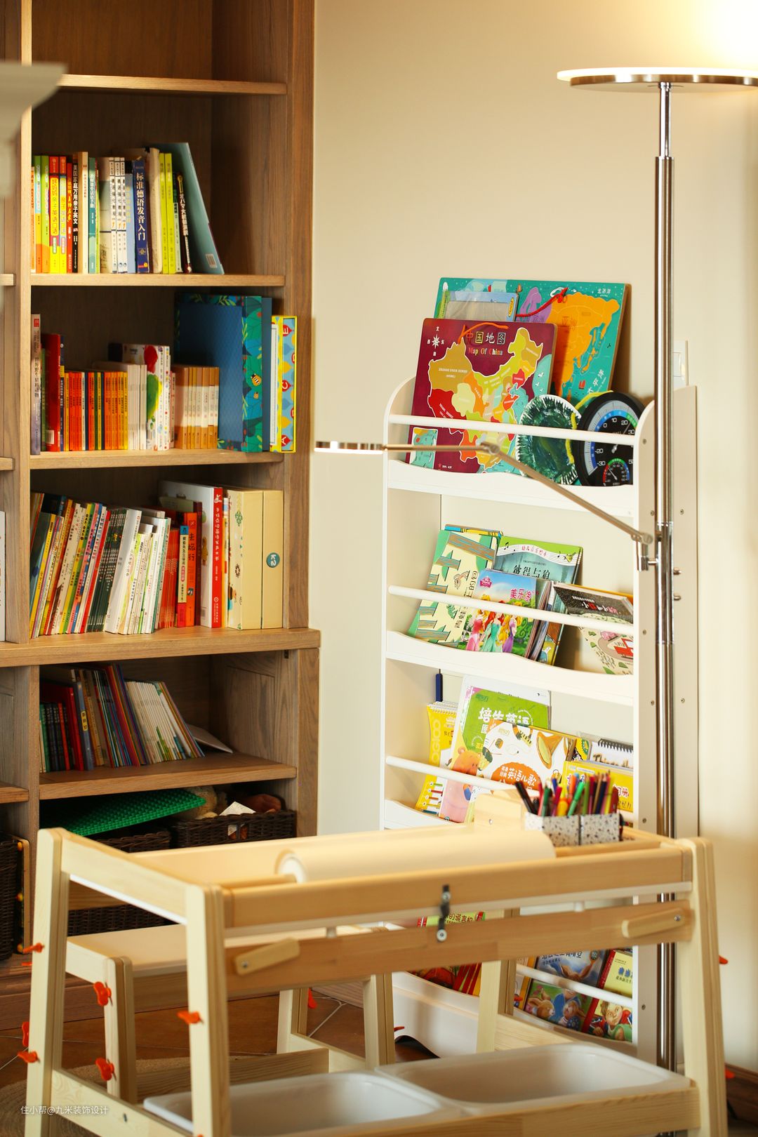 经过玄关来到客厅,乍一看中间的电视墙可能有点突兀,但是仔细看下来,恰恰是这个隔断将客厅一分为二,功能分区十分明确,一边可以休闲喝茶聊天看电视,另一边办公学习一家三口的位置都安排的妥妥当当的。看得出夫妻二人是十分重视对孩子的教育的。客厅具备了相当大的储物空间,两面的背景墙全部做成了储物柜,而且已经整整齐齐的摆满了各种各样的书籍。