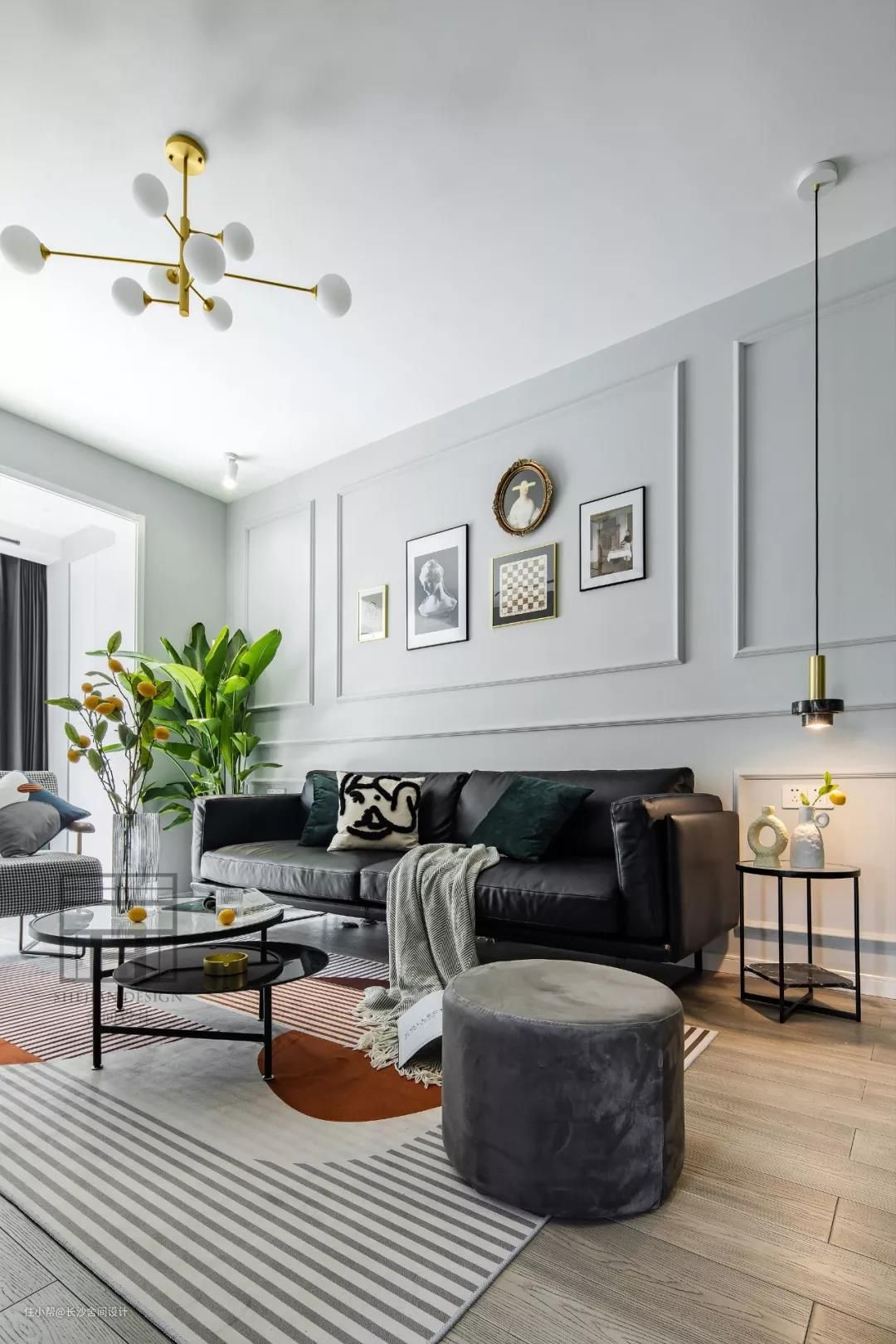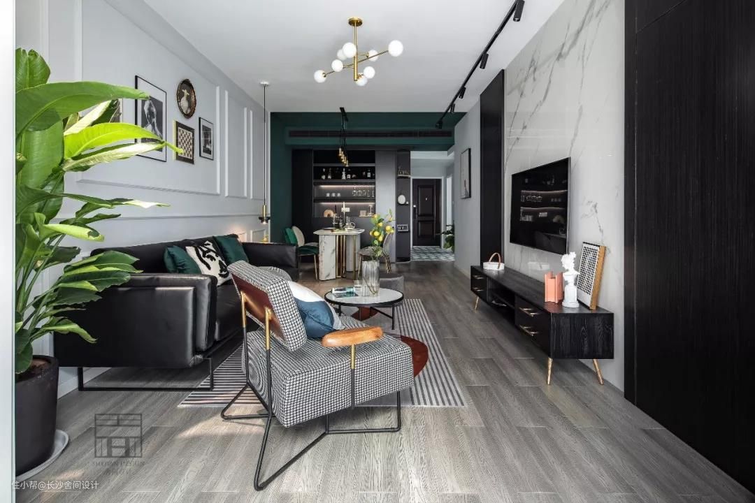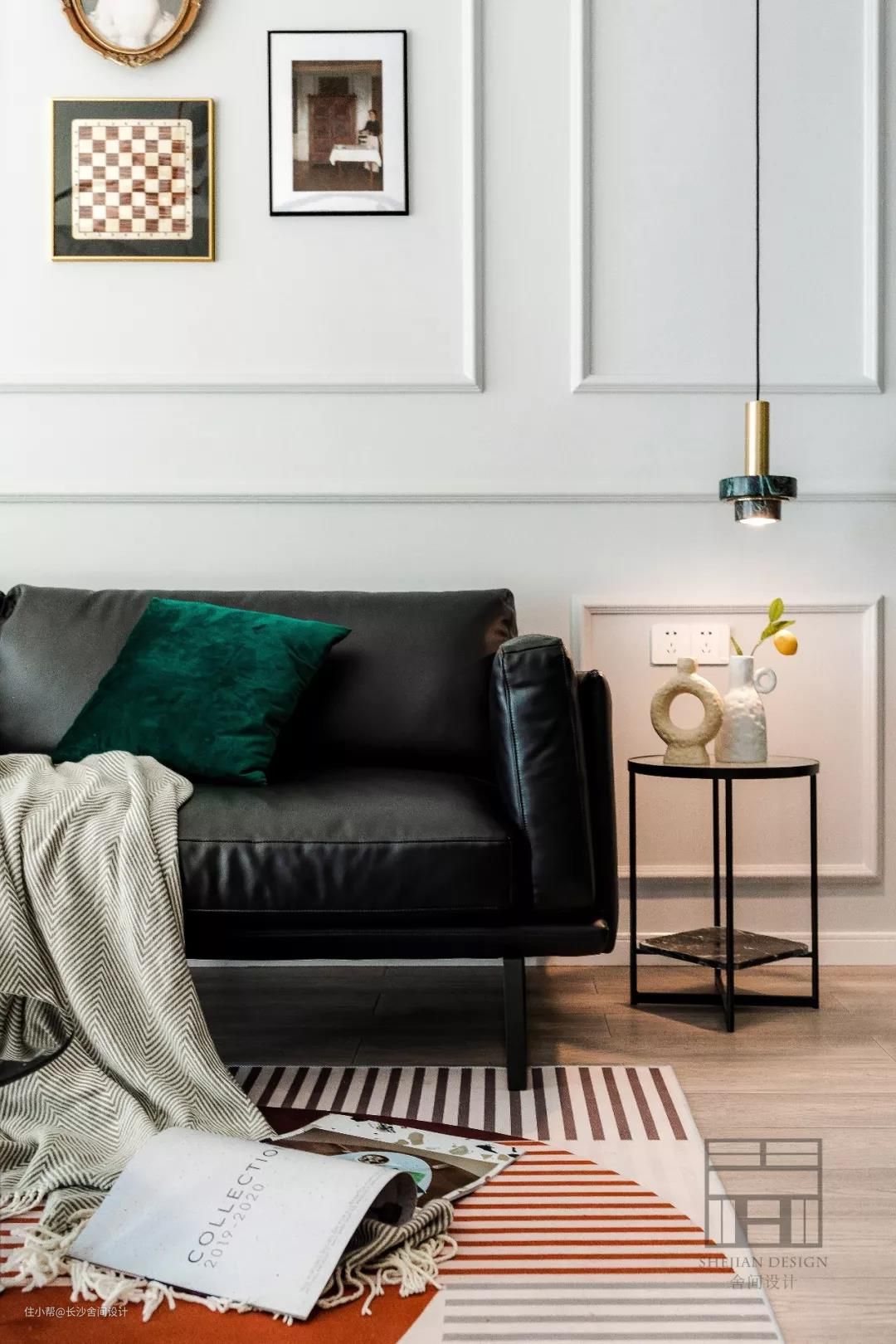 用黑色皮质沙发和灰色石膏线打造空间的层次感,绿色丝绒抱枕和旁边的小吊灯为空间注入生命力。 边上的小边几与沙发相呼应,这样就可以添加不一样颜色的小东西空间也不会太跳。