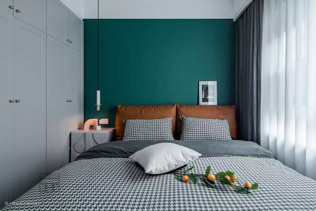主卧的墨绿墙配上棕色皮质靠垫搭配在一起,温馨而有质感。 床头吊灯点亮床头柜,这样看起来,仿佛一下就治愈我们不好的心情。 整面墙到顶的衣柜,增大空间方便收纳,要知道女孩子的衣服就是多,灰色的柜子配上金色的把手,平开门比推拉门更加的方便。#主卧#衣柜