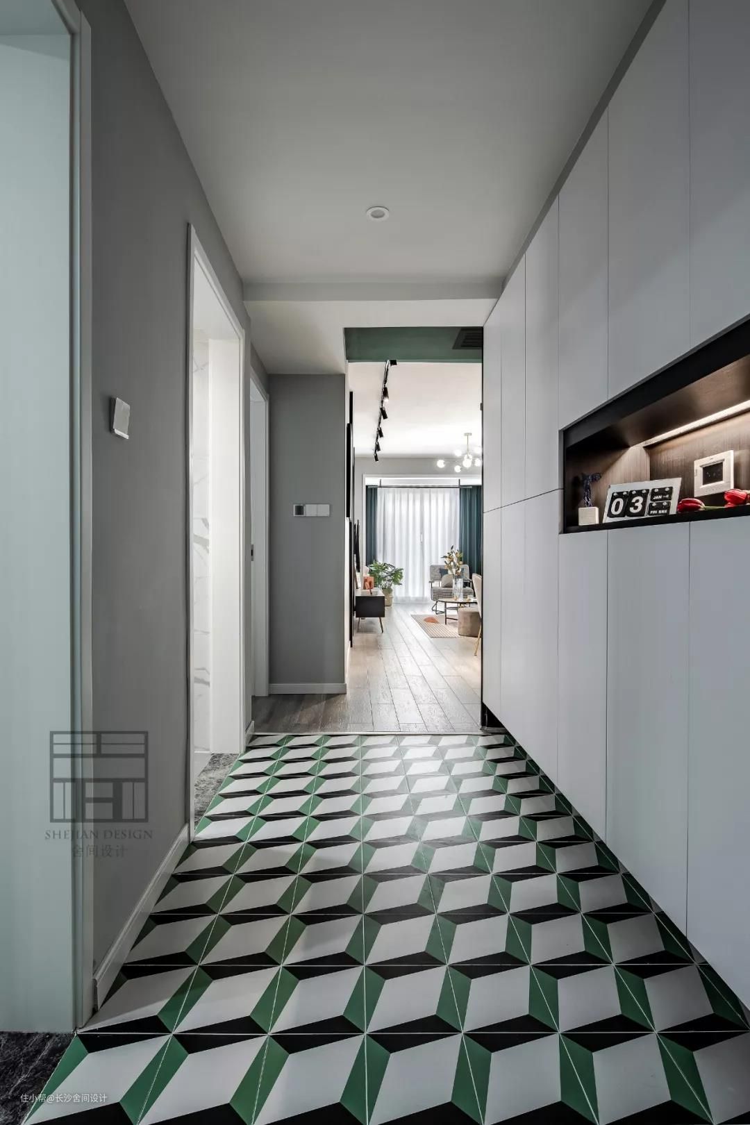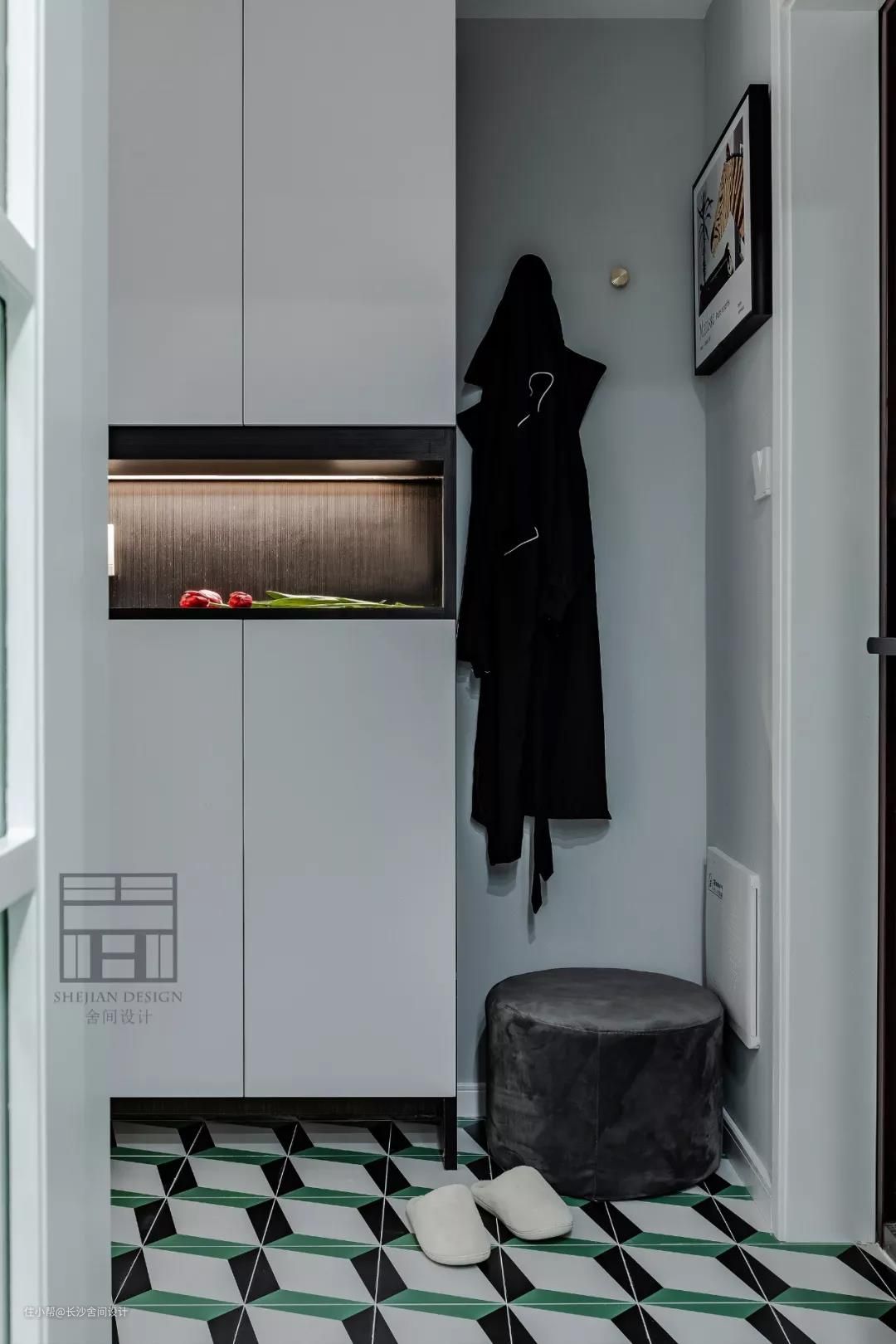 玄关处的花砖从一入户就彰显了这个家的个性,与其他空间进行区域划分。 女孩子的东西总是会特别的多,所以做了一排的柜子进行收纳,满足需求。#玄关#花砖#鞋柜