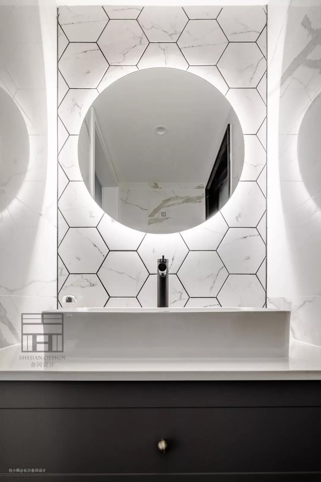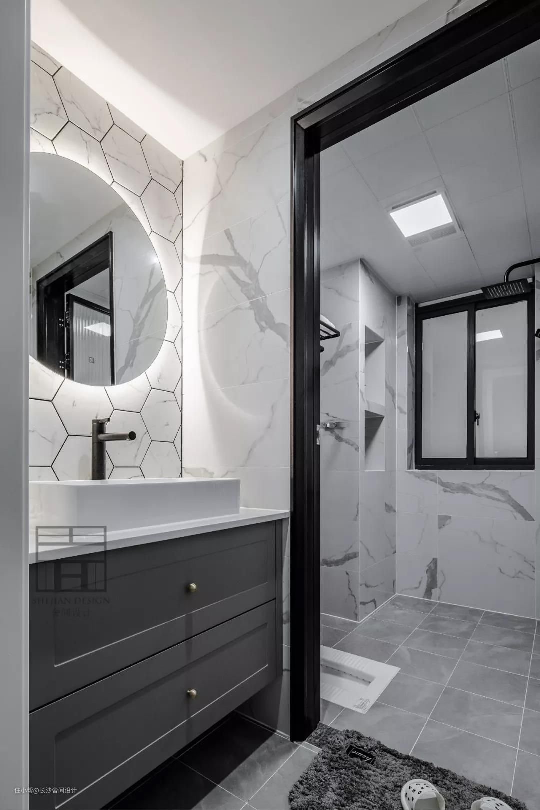卫生间简单的黑白灰,空间开阔明亮,洗手台处的六角砖和大理石瓷砖很耐看。#卫生间