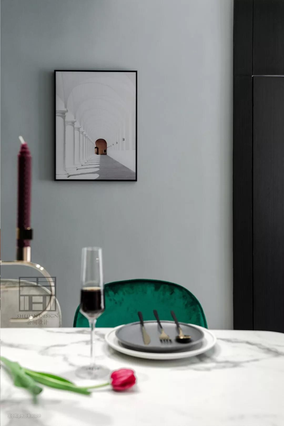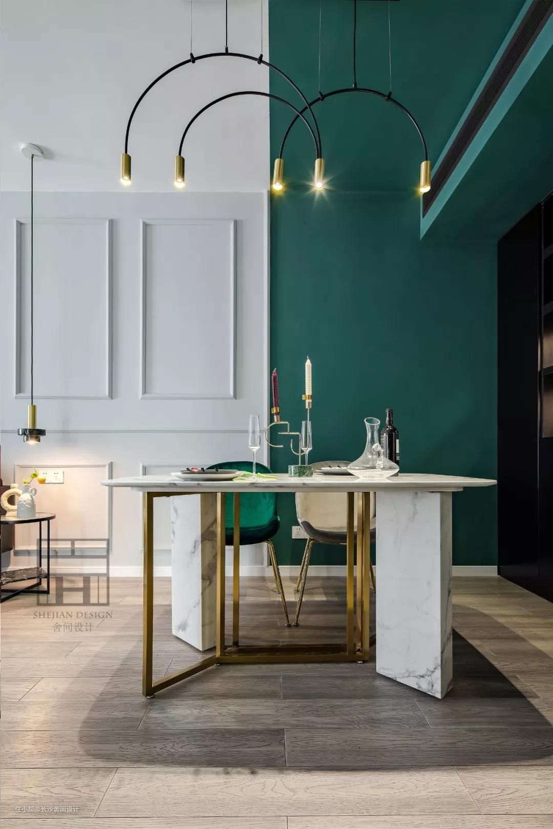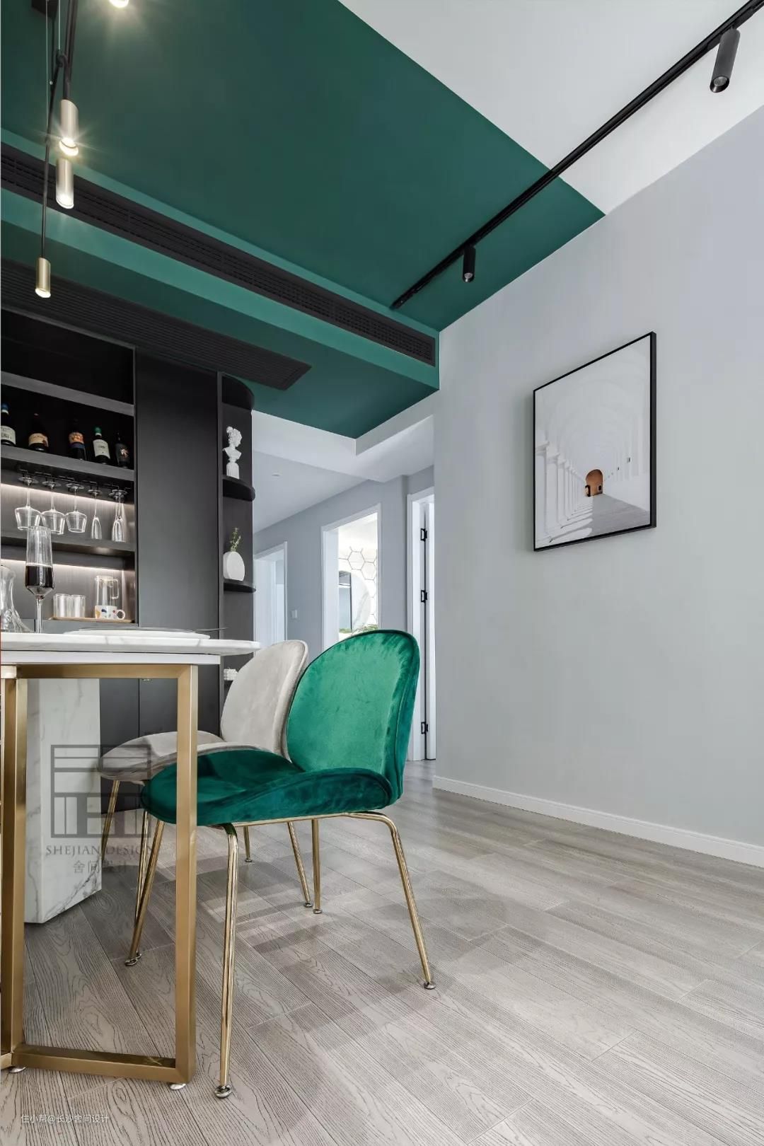 为了让整个空间协调性,只用了黑色与绿色,就连风管机的出风口,也刷成了黑色,使人的视觉效果好,舒适,黑配绿高级感就出来了 。 大理石与黄铜的餐桌搭配甲壳虫丝绒椅,整面黑色开放式酒柜,让用餐开始有了仪式感。 #餐厅