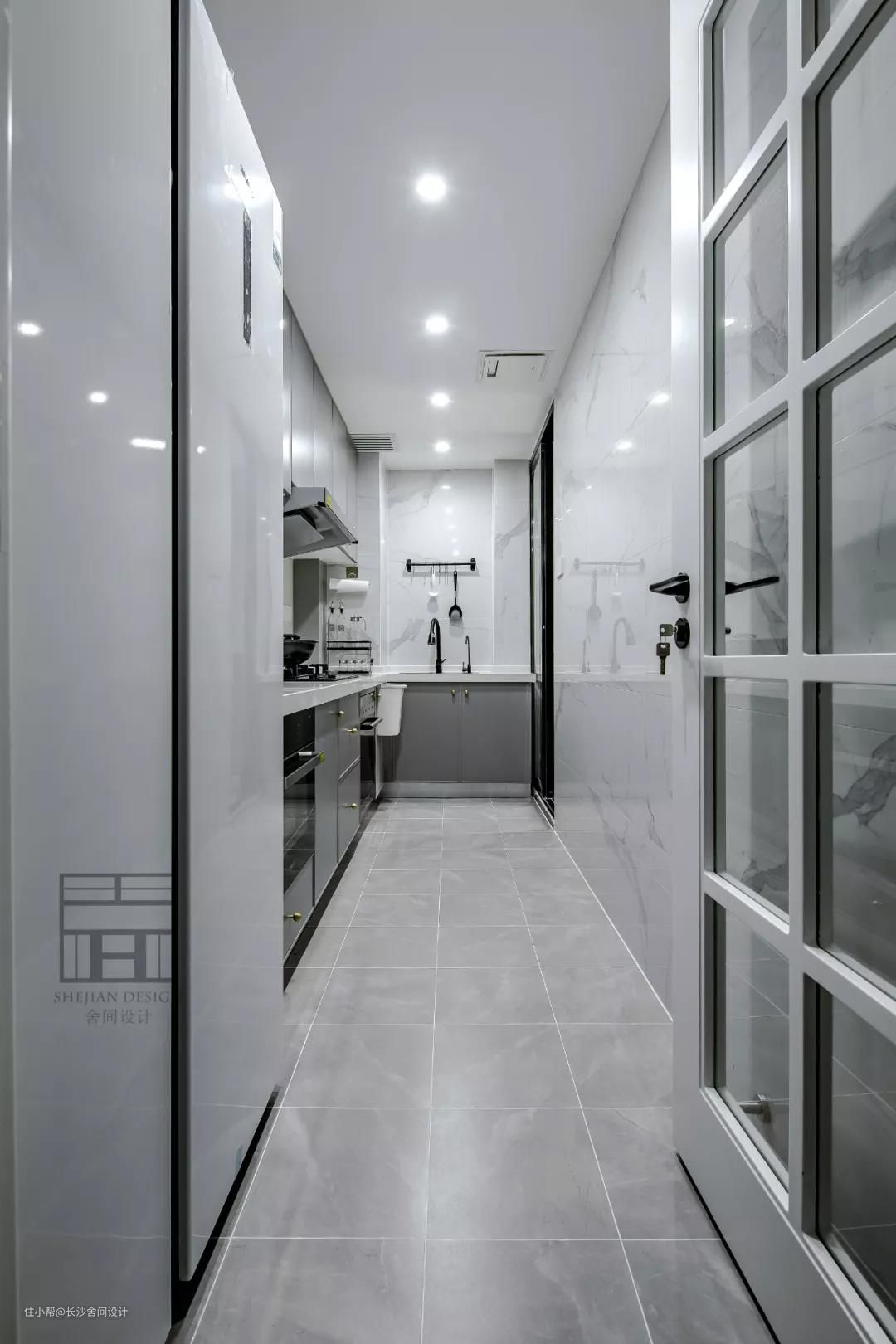 厨房空间较为狭长,根据墙体按照L型摆放橱柜,最大化利用空间。以简约灰白为主,哑光地砖耐脏也易于打扫。#厨房