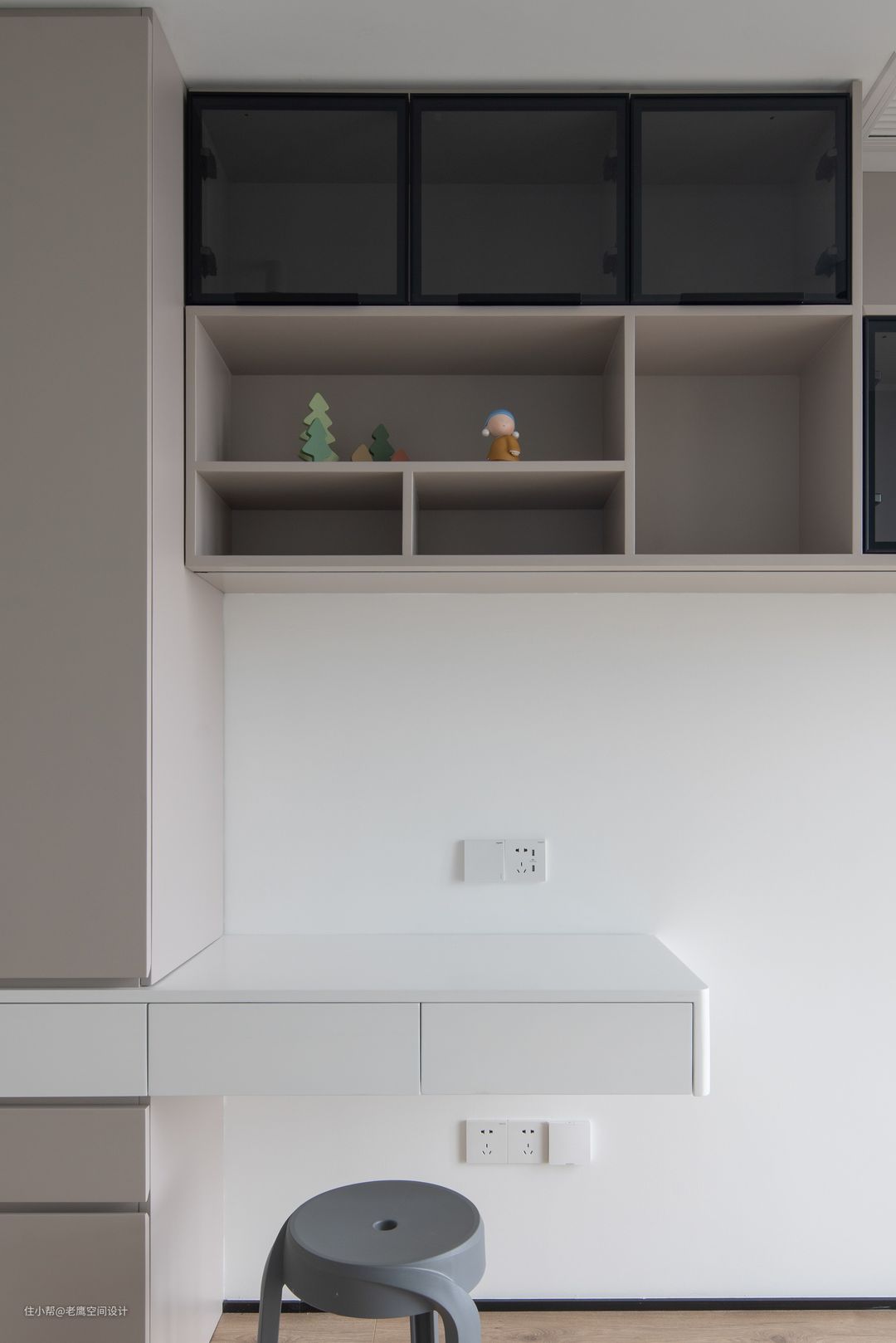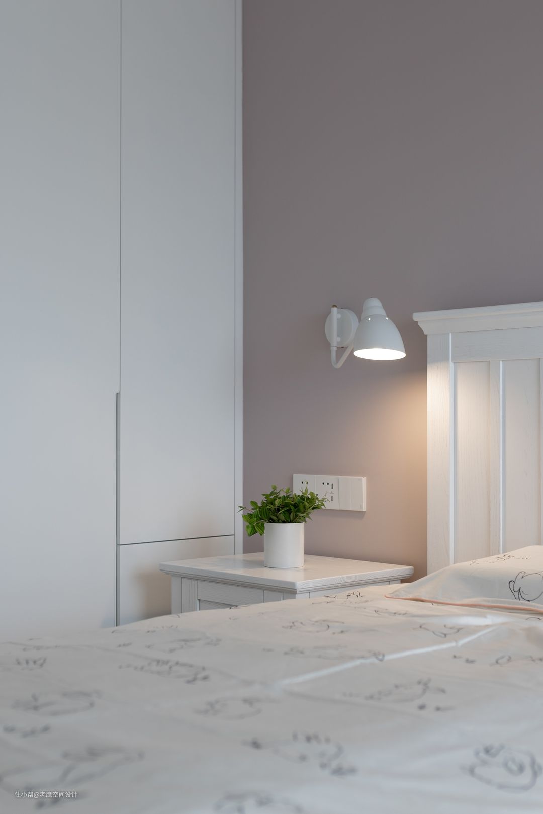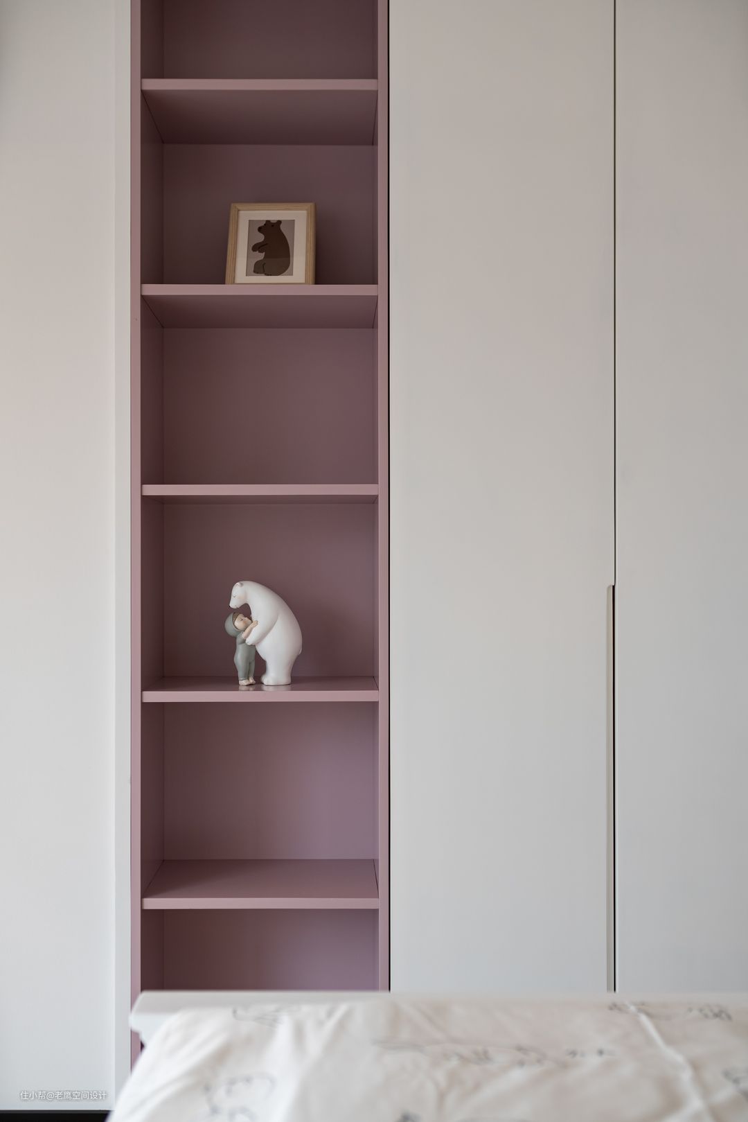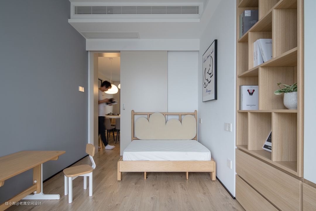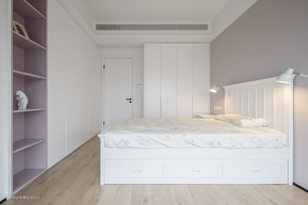 大女儿房整体延续房子干净整洁的风格,白色搭配低饱和的灰紫色在壁灯的暖光下让女儿房看起来如梦如幻。床尾及侧边都做足了衣柜,女孩子总是爱美的,可以收纳很多漂亮的衣服和小裙子啦~灰紫色的开放柜放置可爱摆件及书籍都是不错的选择!床是定制的上下床,在偶尔客人留宿的情况下需要两个小姐妹同居一室,具有更多的可能性。