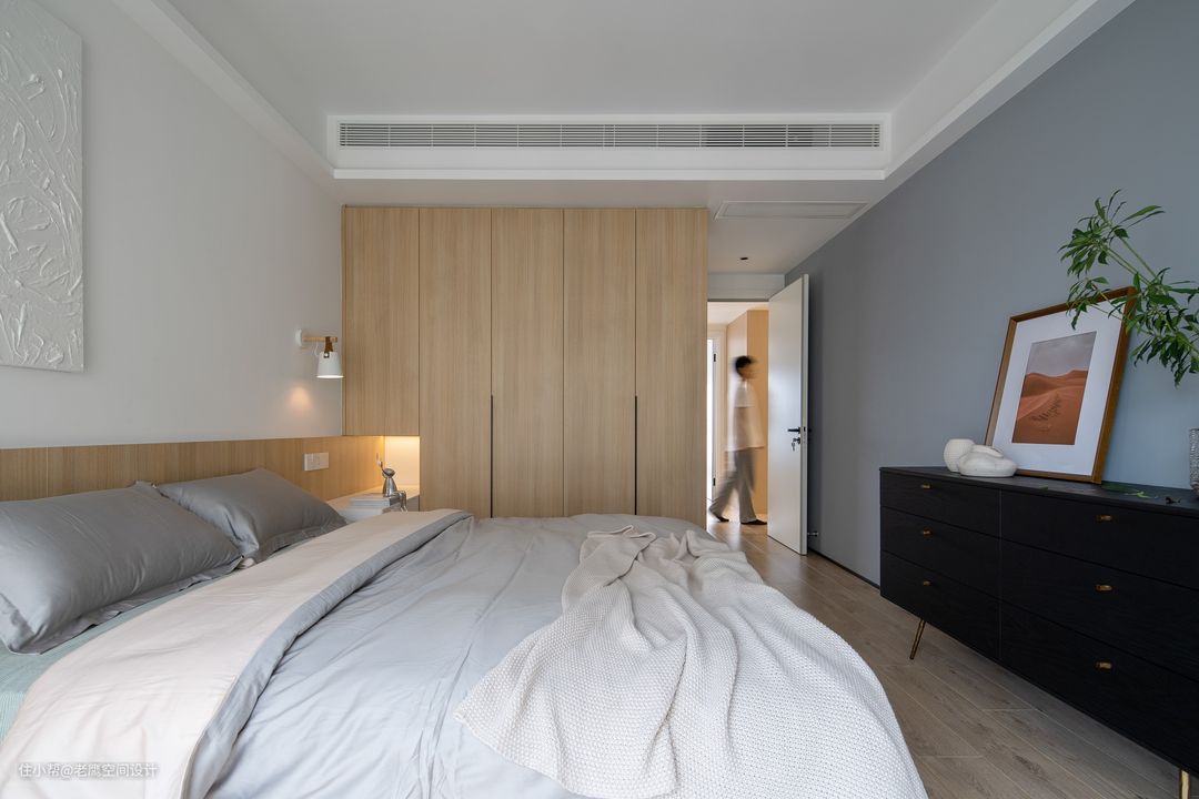 主卧床头采用木纹护墙板从衣柜延伸转折至窗户,颜色花纹与衣柜、地板相对应,形成一个整体。靠墙的衣柜门在满足床头柜的情况下不方便开关门,将下方床头柜从衣柜延伸飘出,上方正常作为衣柜储物,四门衣柜收纳功能强大,床尾空间富余也安置了一个斗柜增加储物。
