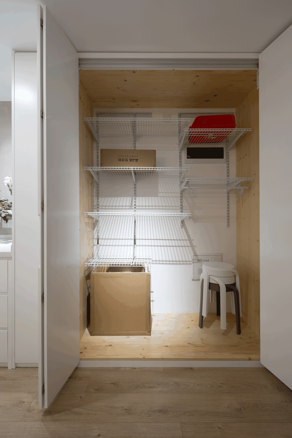 厨房望向玄关视角 进门玄关利用宜家博阿克塞收纳柜的柜深做了一个小型却顶天立地式的鞋柜,中间开放区域可随手放置钥匙、包包等物品,十分便利。对面做了一排矮柜作为鞋柜的补充,收纳强大。 整个空间的柜门或隐形房门都采用无把手形式,视觉上更显干净利落,长虹玻璃及白色柜门对于光线的透视及反射起到极好的效果。