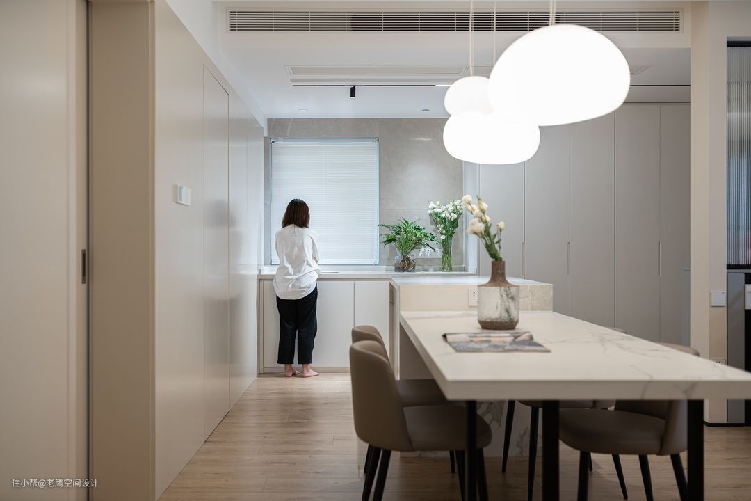 餐厅望向西厨吧台 整个空间色调趋于低饱和,略去了房门及柜子把手的存在显得敞亮简单。