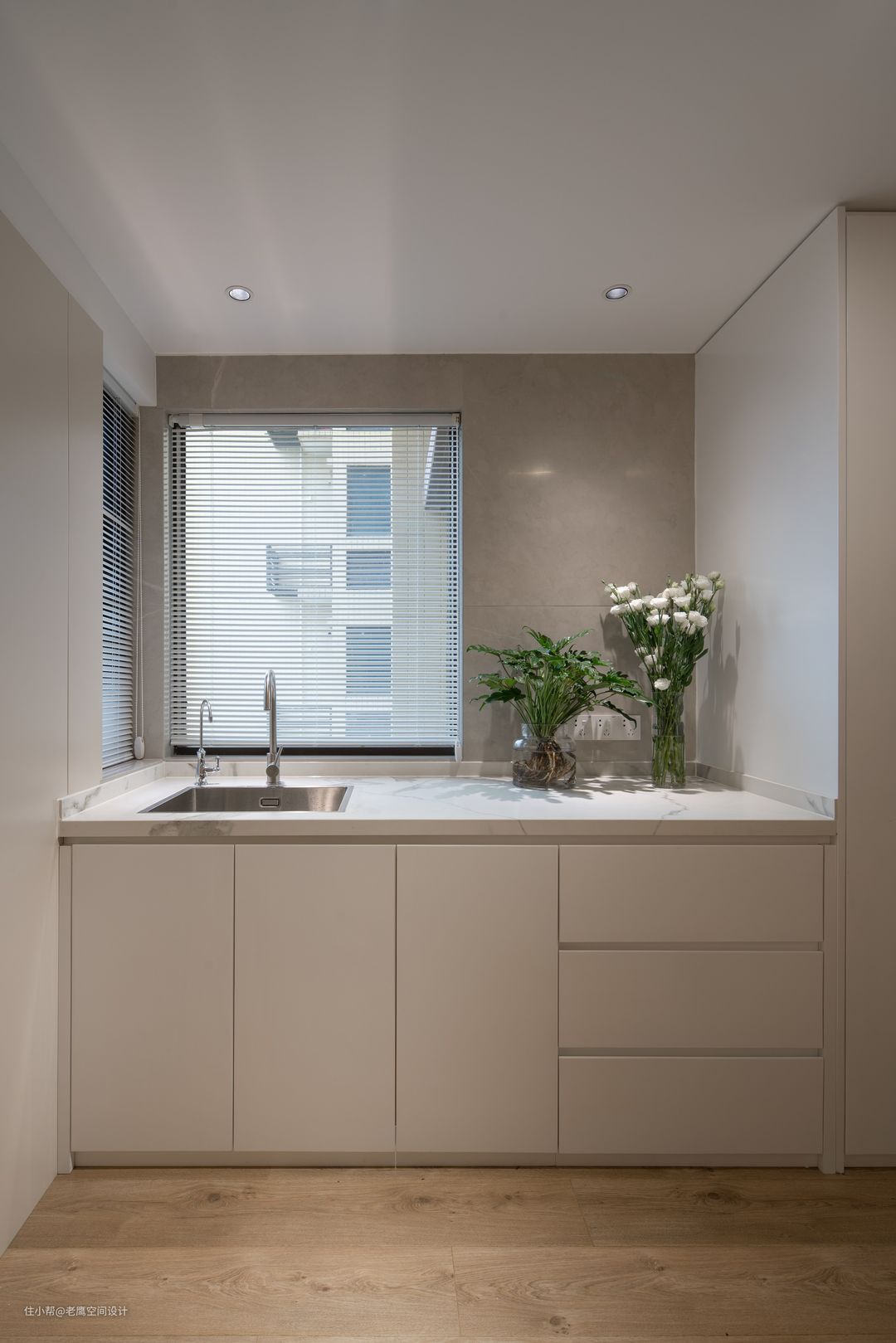 玄关视觉尽头做了一个西厨吧台区,咖啡或茶都是很好的选择,烘焙也不会被局限于厨房,具有更多的可能性~这个空间没有遮光的需求,选择百叶帘既能很好的保护隐私,也能创造极佳的光影效果。