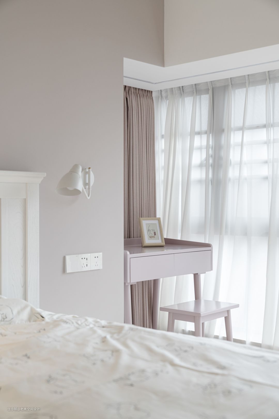 L型的窗带来良好的采光,于窗边安置一个梳妆台,利用自然光线进行妆点也是极佳。白色肌理的挂画融入床头背景不争不抢。