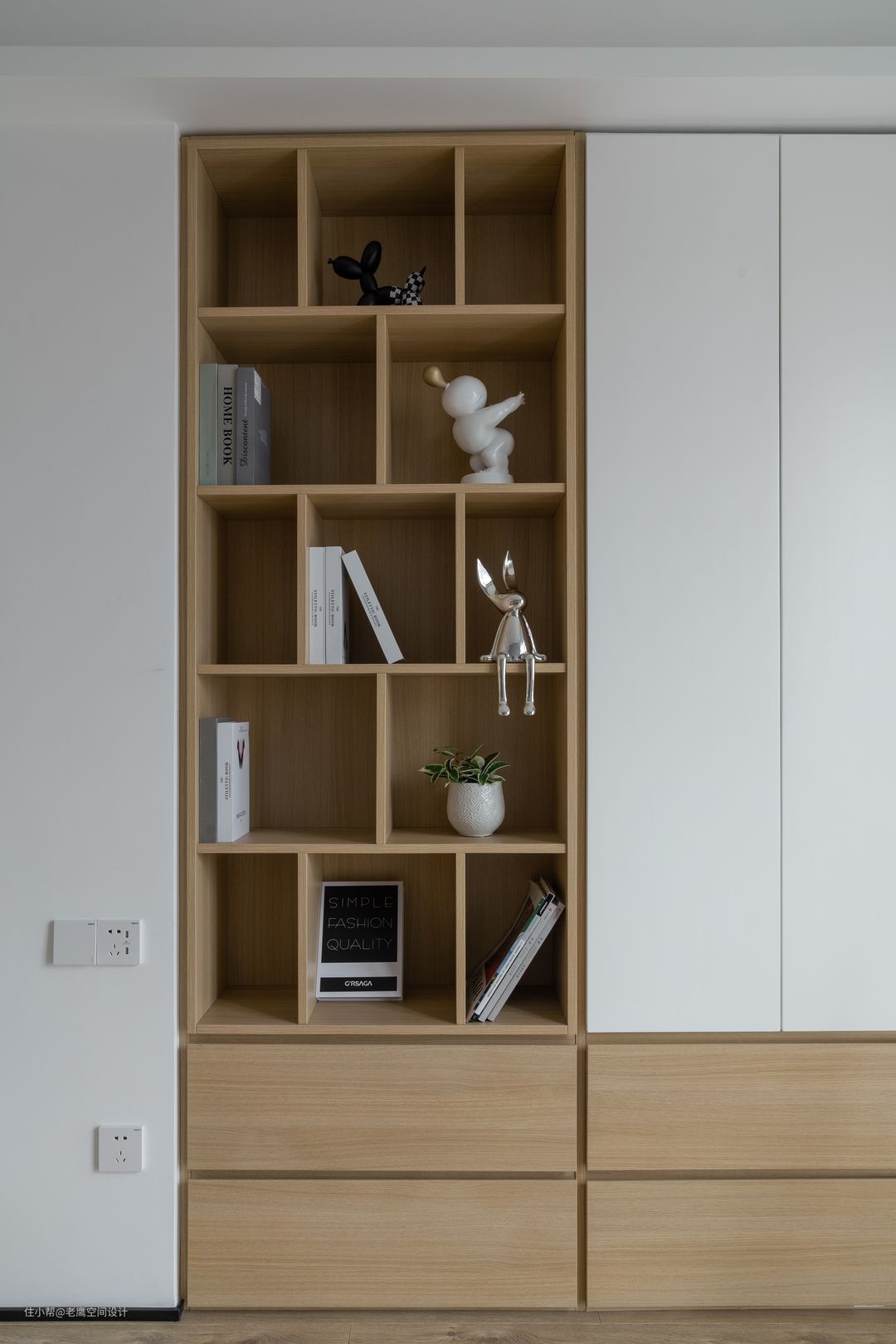 书柜细节 格子根据比例大小不一的分割,方便放置书籍与摆件。