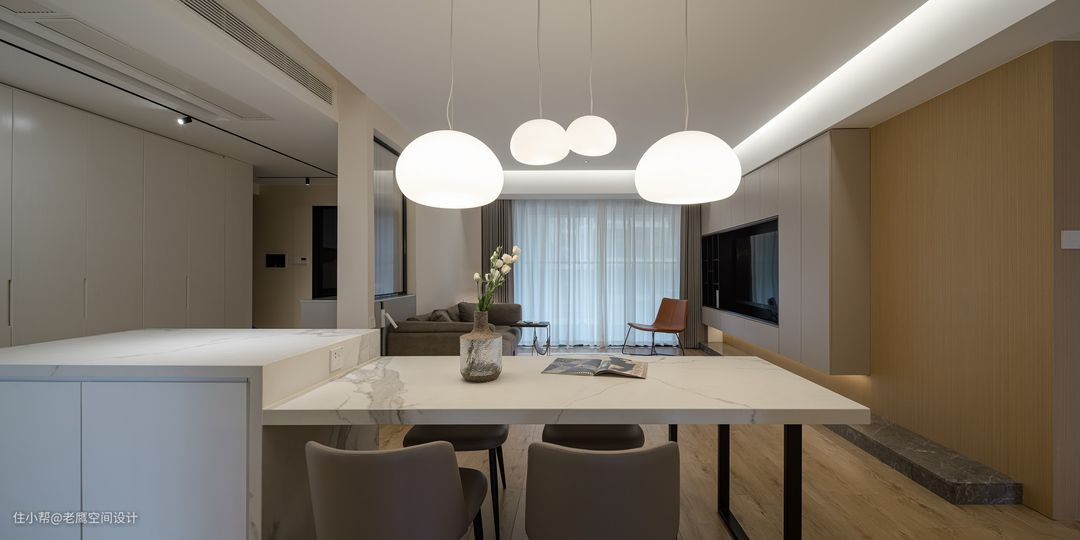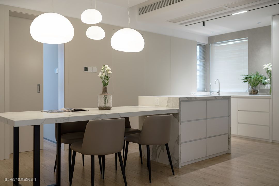 餐厅是岛台+餐桌一体化的设计,岩板材质的台面与客餐厅整洁明亮的风格一致,也更便于打理。圆润参差的吊灯弱化了餐桌的锐度。岛台两侧做了抽屉+柜子的组合增加收纳,无需餐边柜。台面上下都设置了插座,可随时开启火锅趴~