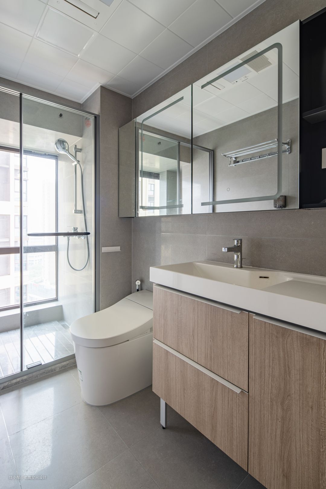 主卫与公卫格局一致,干湿分离三件套。镜柜与洗手盆柜增加日常收纳。