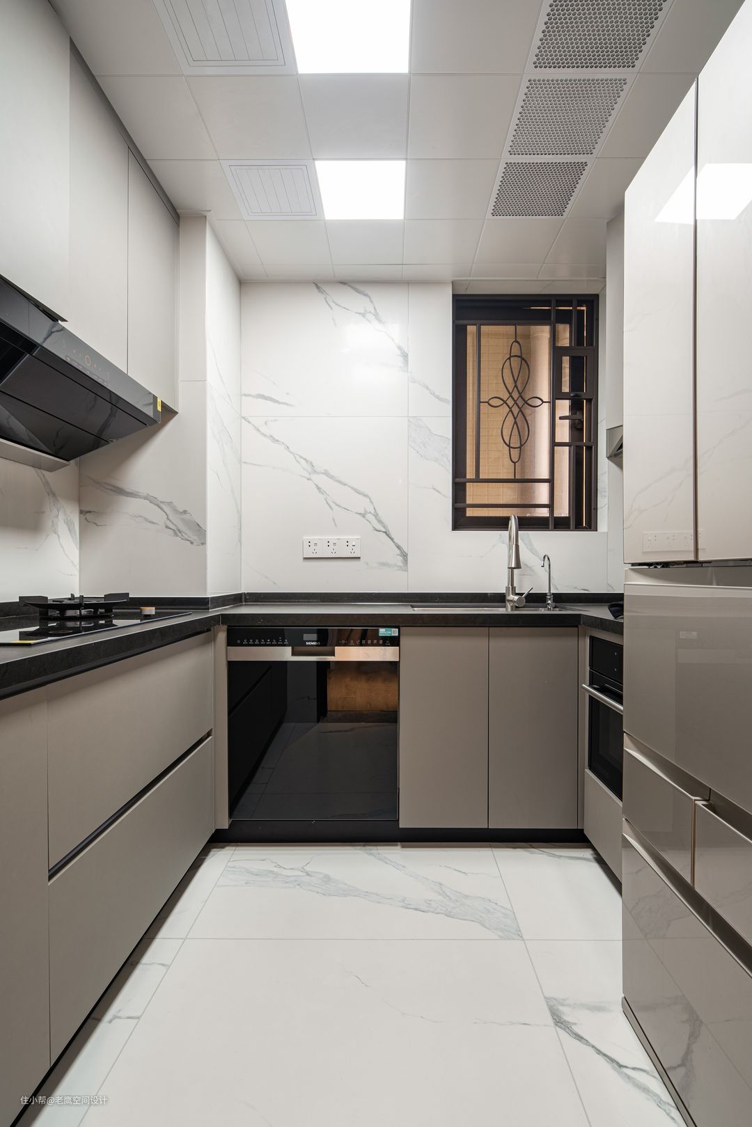 U型的厨房可同时容纳多人下厨,厨房原始采光不是很好,在灯光上进行一定程度的优化,墙面与地面也选用岩板提亮,且更便于卫生的打理。