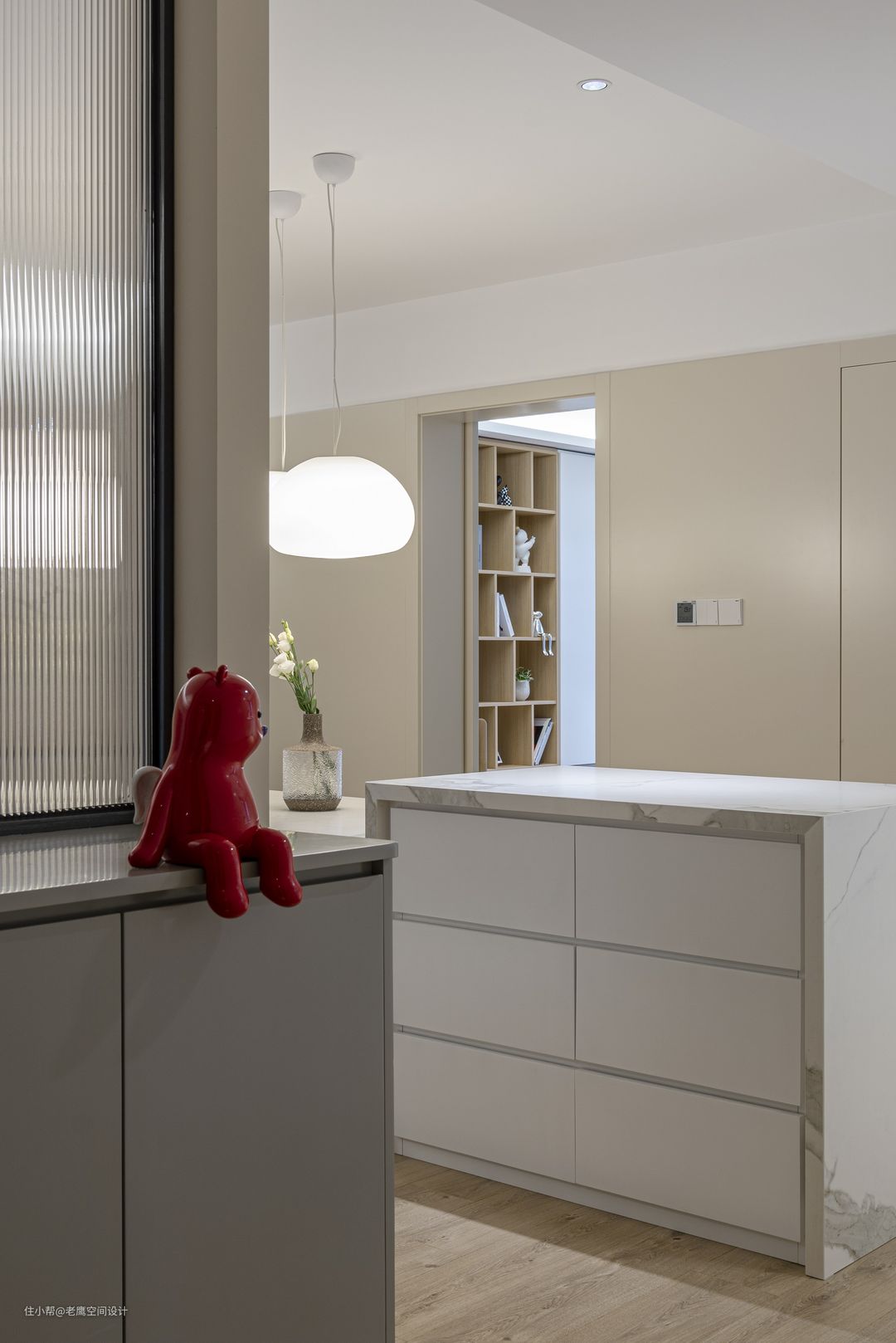 玄关望向餐厅 艺术家张占占的PUPU熊给整个素净的空间点缀一摸跳跃的色彩~
