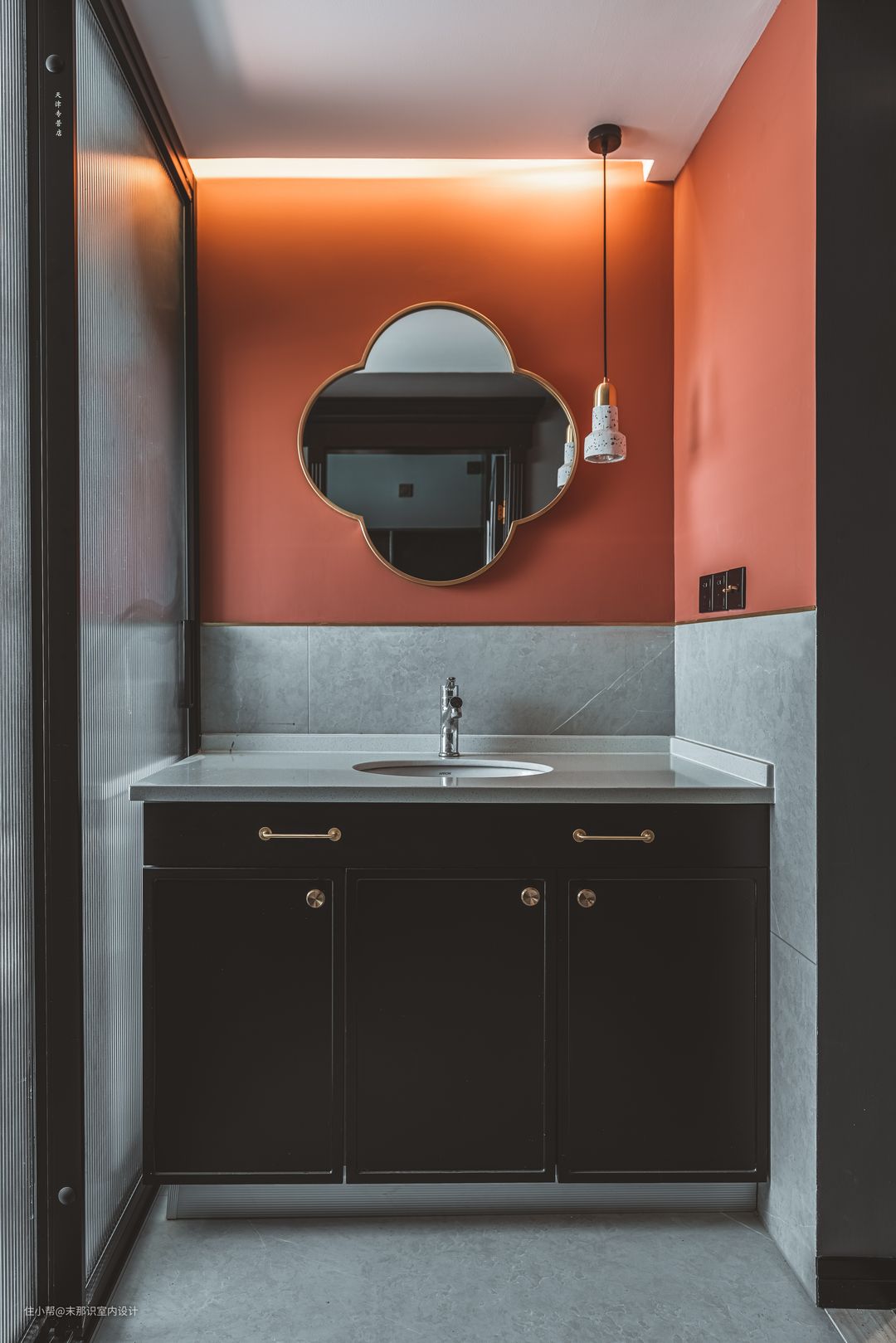 卫生间选用了经典的红黑配色,结合一些金属和大理石的材质,复古又摩登。 镜子的造型依旧选用梅花的形状,和其他空间部位的梅花窗造型相互呼应。