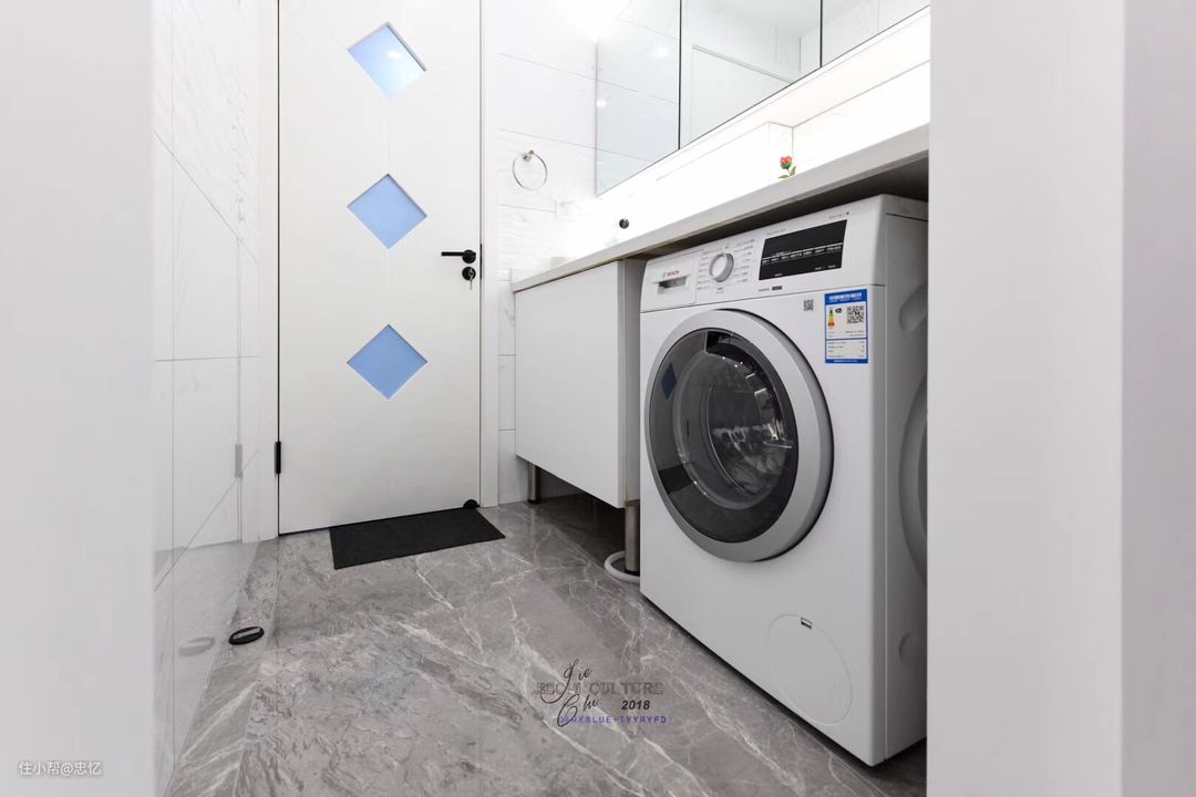 洗衣机放在公共卫生间干区台盆的下面,这样设计节省空间,台面统一,双台盆配上一大片镜子,真的很大气,以后家里来人也不用担心早晚洗漱冲突的时间了