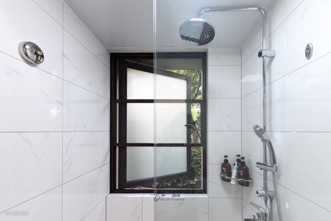 这个位置是客厅的卫生间湿区,淋浴房设计。因为主卧里面是浴缸,所以这边留了淋浴区,又考虑家里来人方便干净淋浴比较省事省心 ★墙面的瓷砖采用了300*600的墙砖,颜色灰白色纹理清晰,也是极简风格常用的单品,
