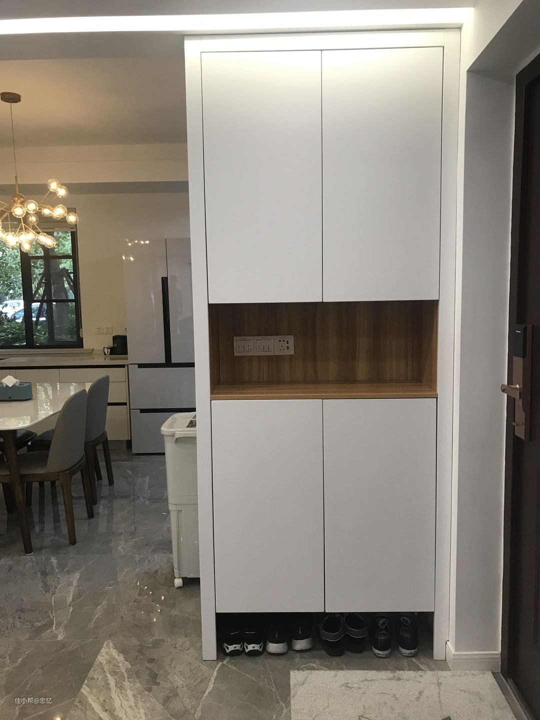 开门就可以到入户的鞋柜,因为尺寸的问题,鞋柜面积不大,中间做台面,下面做悬空用来方便换鞋,柜体只是用来放长穿的鞋子,中间的台面就放钥匙小物件之内的东西