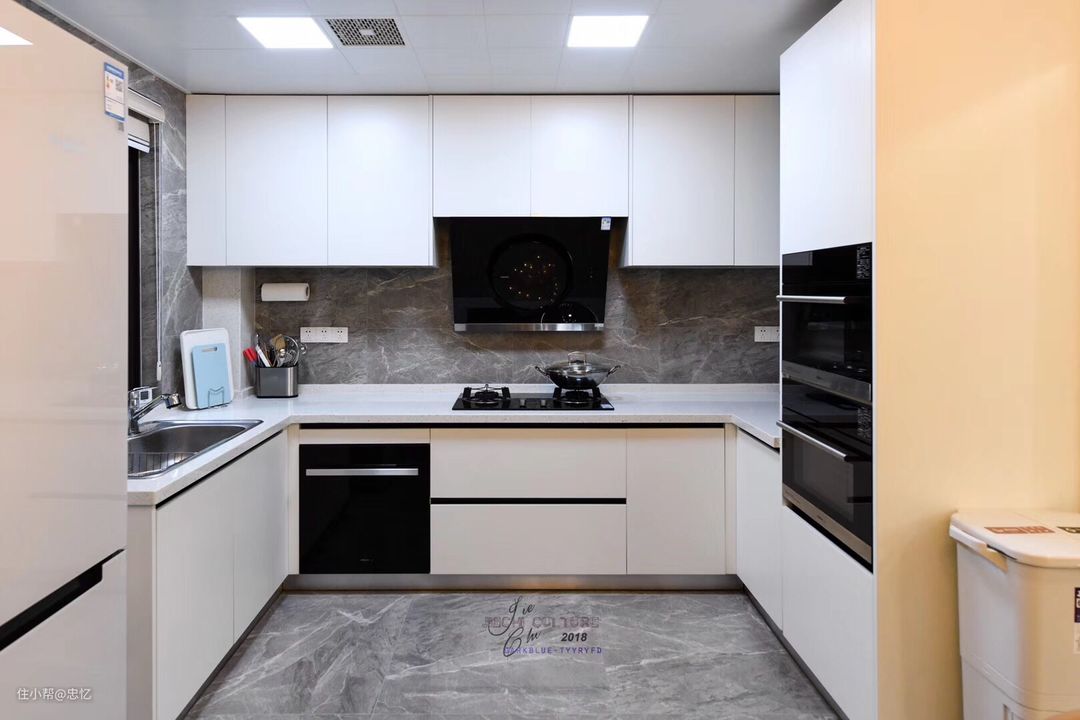 厨房根据户型设计的是“U型”全屋定制的橱柜这样做效果看上去很大气,整个从水槽到高柜嵌入式电器,形成洗涤区、烹饪区、操作区和储藏区划分明确;冰箱、水槽和炉具间的关系能行成一个正三角形,由于动线简洁方便,使用起来可以相当得心应手