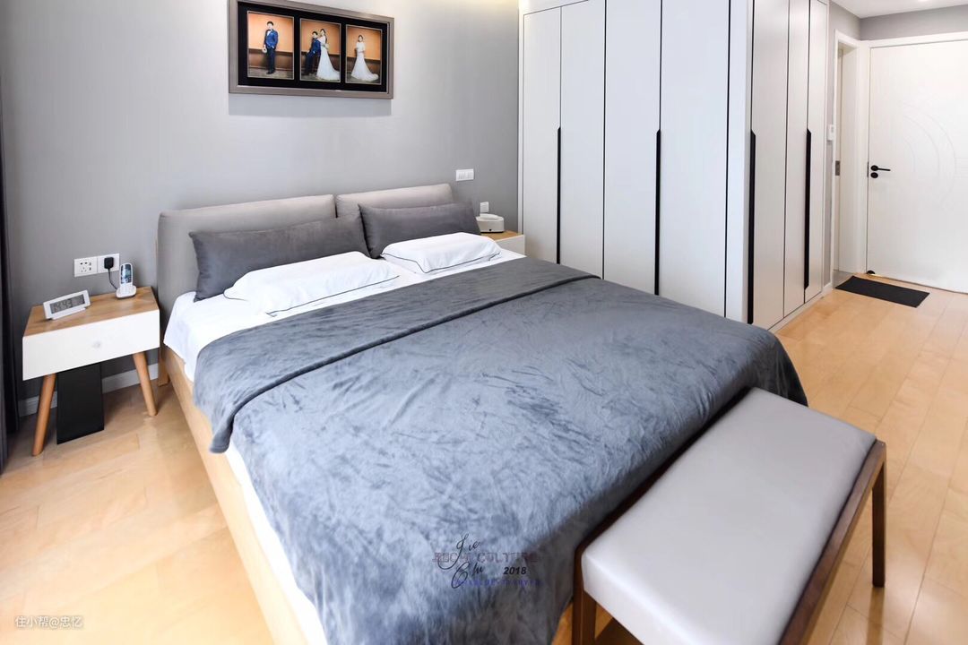 主卧室柜子是选择白色门板,搭配黑色拉手,极简风十足,吊灯也是采用了无主灯设计,灰色的墙面搭配原木色的地板,清爽又高级,业主选择的床品也是简约风格的和整体场景非常搭配