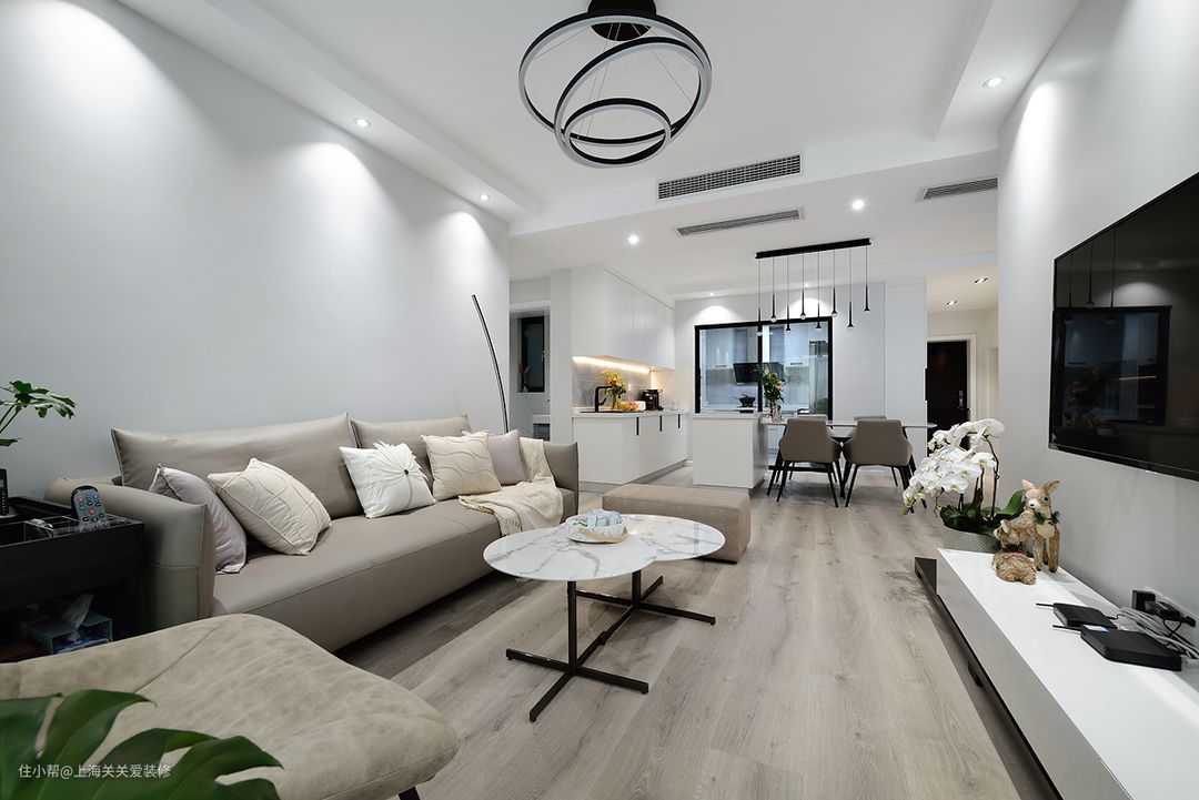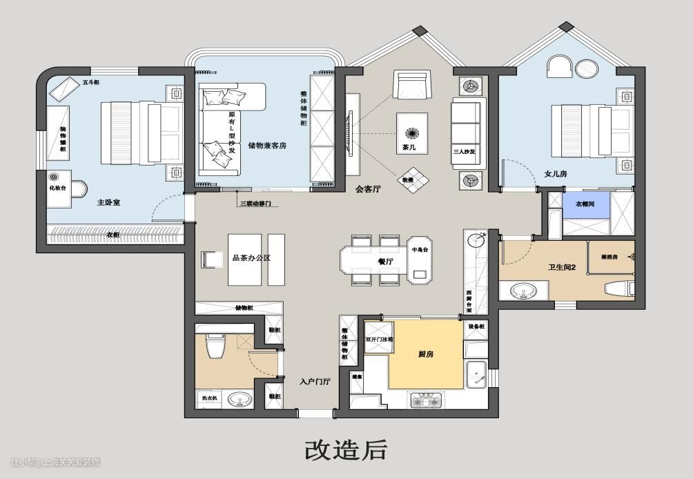 沟通中,她们提到原本客餐厅区域设计不适合她们而且客厅非常暗,一暗就感到空间很小很压抑,所以通过设计改动我把原本的客厅与次卧进行了互换,保持客厅,餐厅,厨房三者动线的联动性。也让整个区域采光一下子变得十分宽敞明亮。