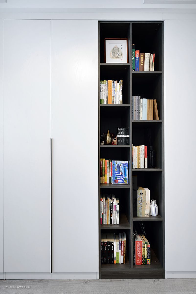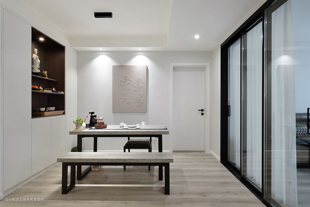 紧接着茶室的柜体结合了佛龛的区域,与外侧的鞋柜连接着,显得柜体在安排的同时并不刻意,主卧室和一间次卧都是合理利用空间定制了一整排到顶的衣柜和储物柜。